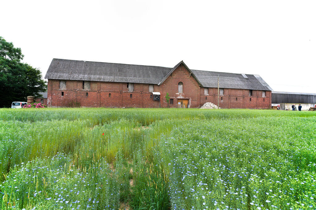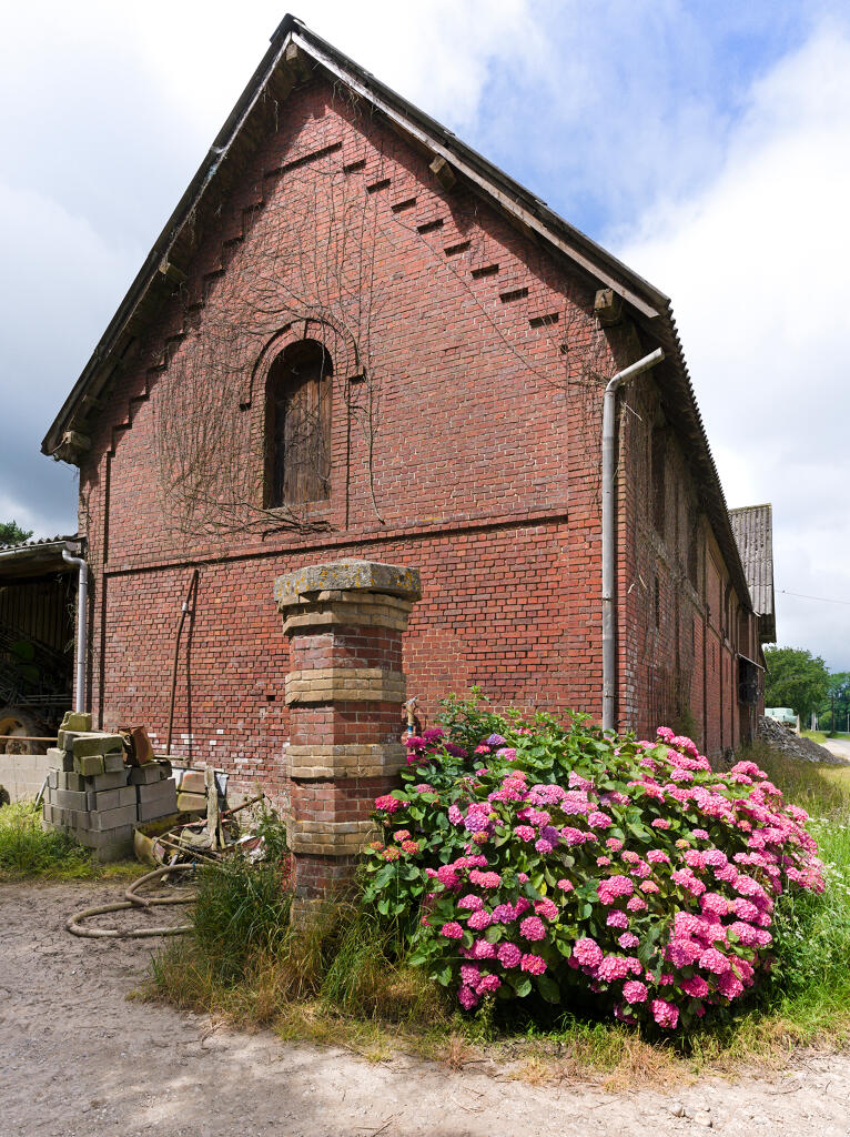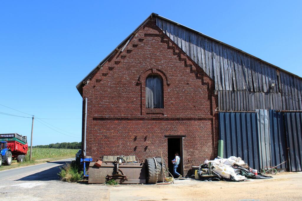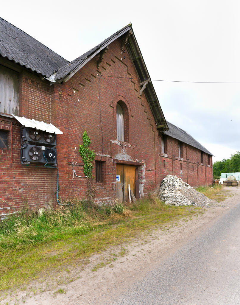 - une imposante étable à vaches bâtie en brique industrielle, en rez-de-chaussée et comble à surcroît, avec partie centrale à fronton éclairée par une baie en plein cintre. Une stabulation moderne a été annexée contre la façade sud.