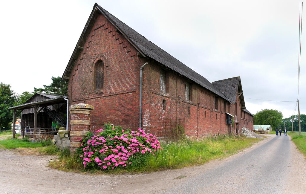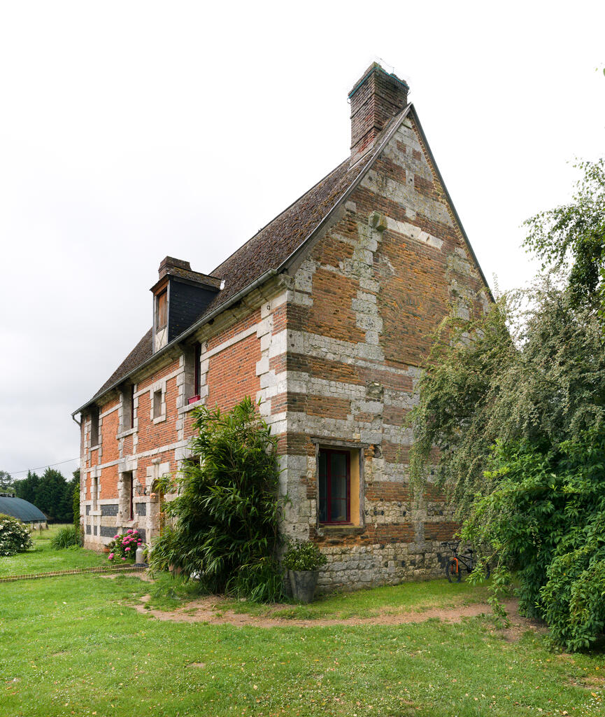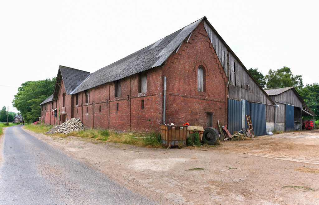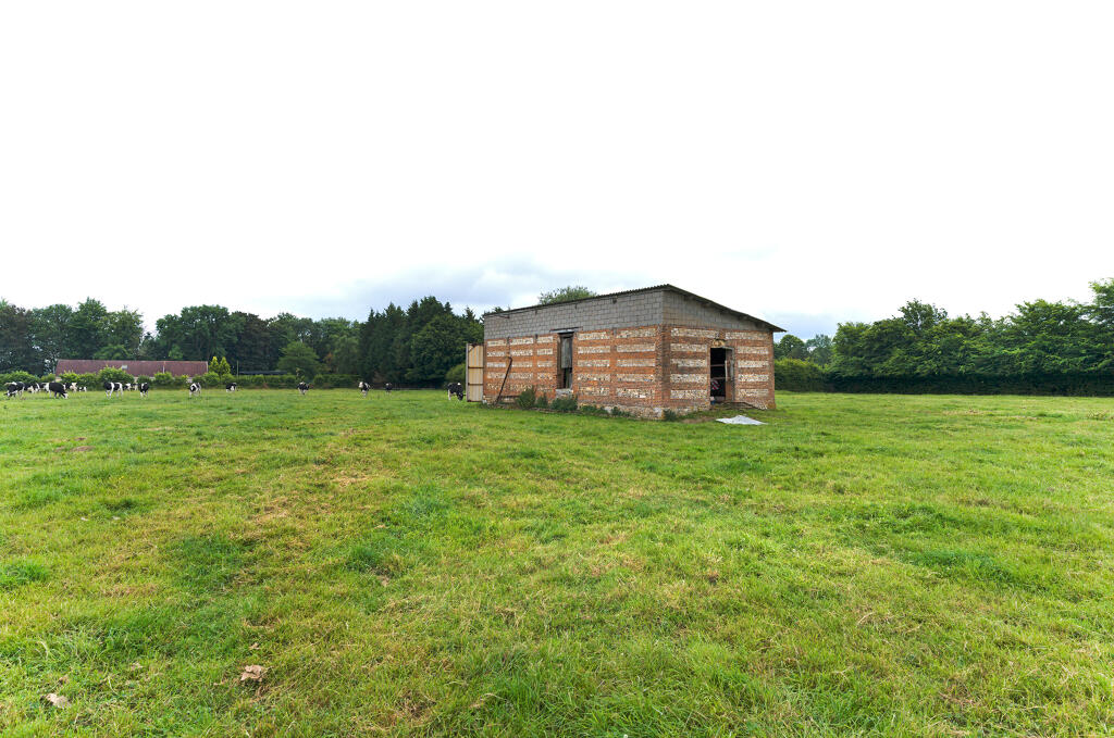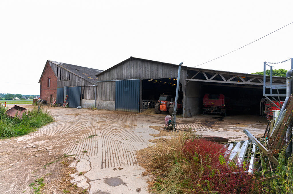 - une imposante étable à vaches bâtie en brique industrielle, en rez-de-chaussée et comble à surcroît, avec partie centrale à fronton éclairée par une baie en plein cintre. Une stabulation moderne a été annexée contre la façade sud.