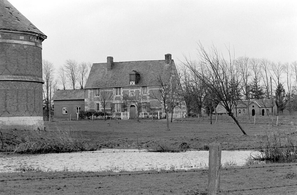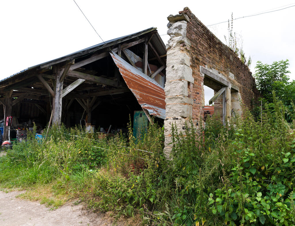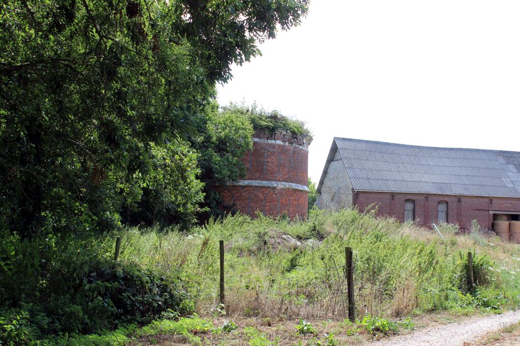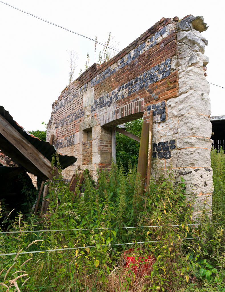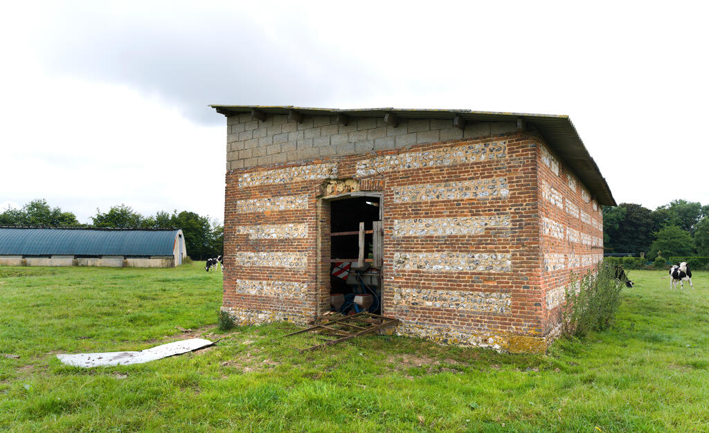 - une étable à veaux en assises alternées de brique et de silex. La construction, en partie arasée, est actuellement couverte d'un appentis en tôle ondulée.