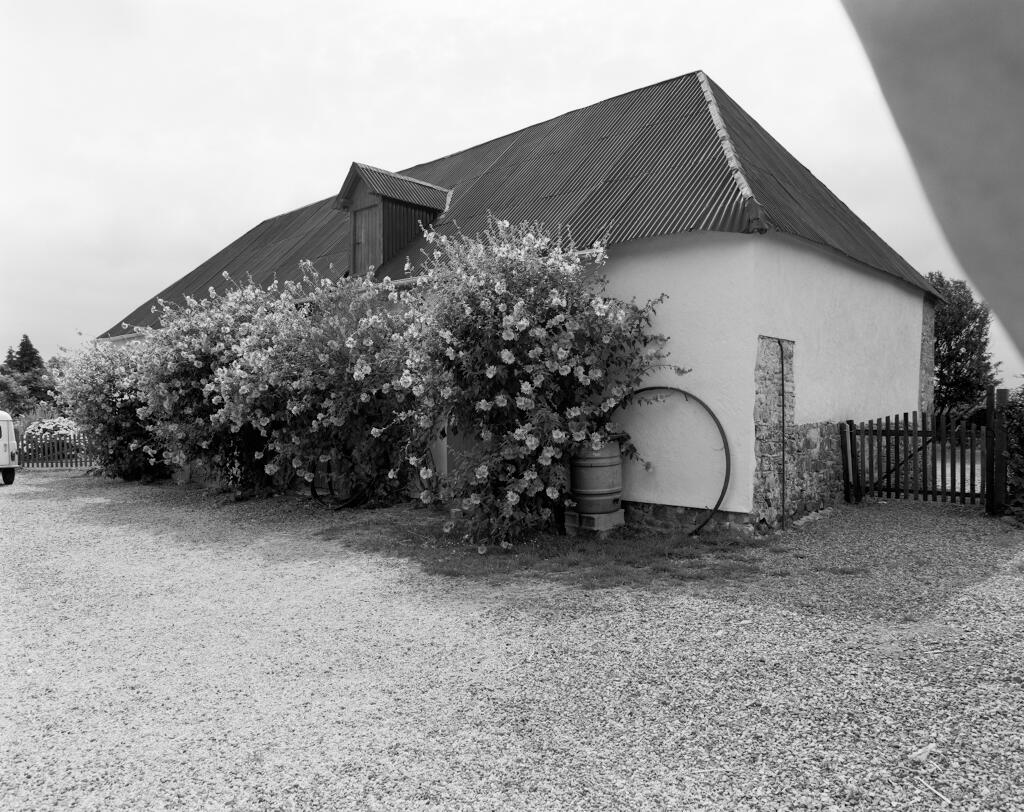 L'enduit ciment est peint en noir pour le soubassement et en blanc pour le reste de l'élévation. Ce traitement des façades imite les colorations des enduits chaux utilisées sur les bâtiments en bauge dans le Devon (Angleterre).