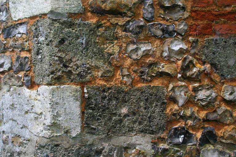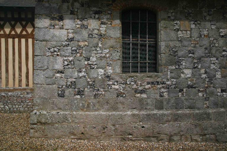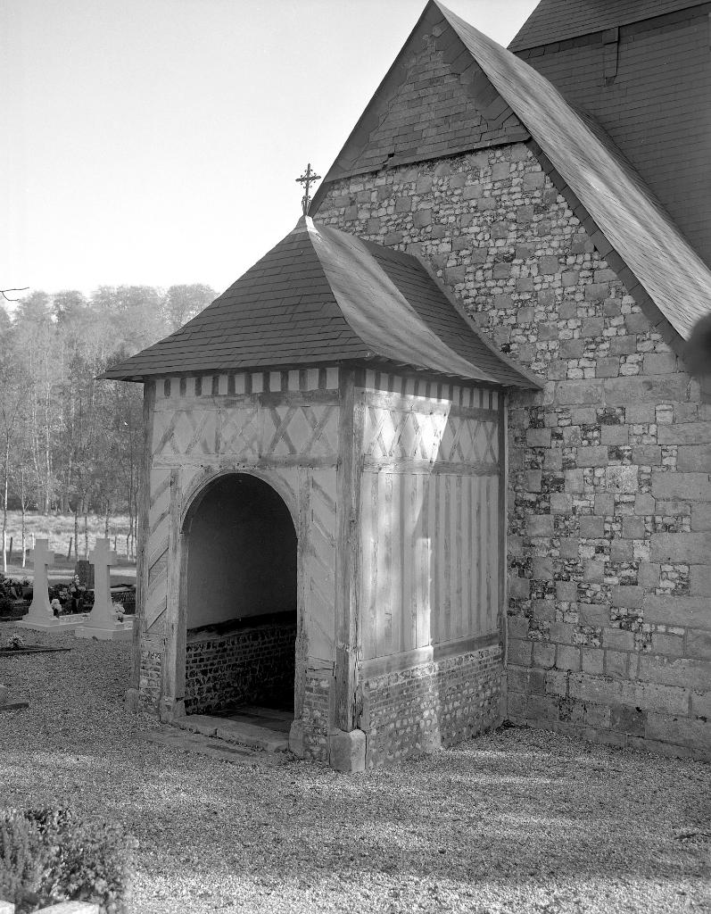 Porche : moderne, pan de bois du 17e siècle, remanié en 1763. Solin en silex et brique, pan de bois : chêne, brique, enduit de chaux
