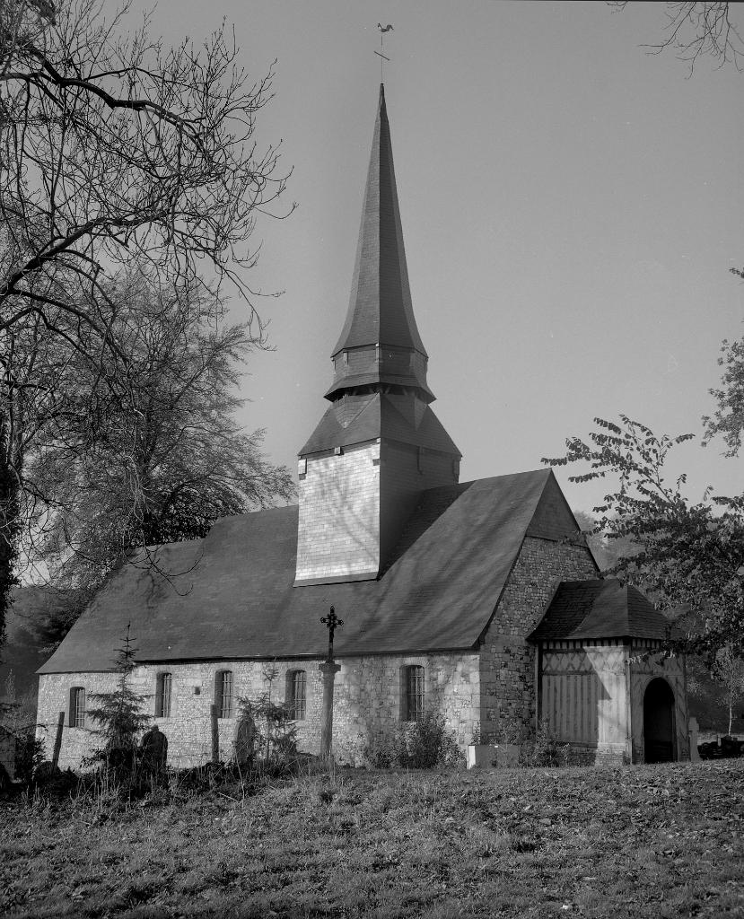 De l'ancienne église du 12e siècle ne subsistent que les éléments de tuf remployés dans les murs. La nef est reconstruite au 16e siècle en deux campagnes, les baies sont remaniées au 18e siècle. Contrairement à ce qui est souvent écrit, le chœur est reconstruit avant 1775 (l'inscription visible au chevet est un simple graffiti). Présente dans le chœur, la stèle funéraire de Pierre Maugendre, prêtre décédé en 1757, fait état de sa participation financière à cette entreprise. Le chœur sera ultérieurement réparé en 1882 (cartouche de restauration au chevet). Le porche date des 16e et 17e siècles, mais a été remanié en 1763. Le clocher est du 16e siècle, remanié au 18e siècle. La croix de cimetière est érigée au 19e siècle.
