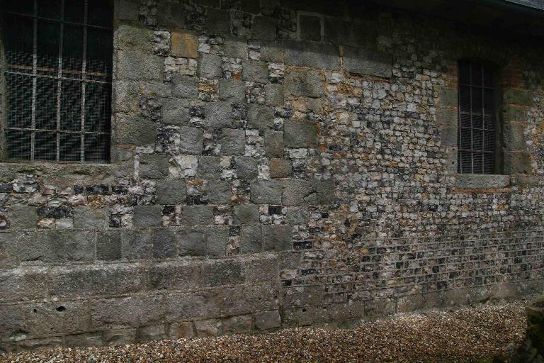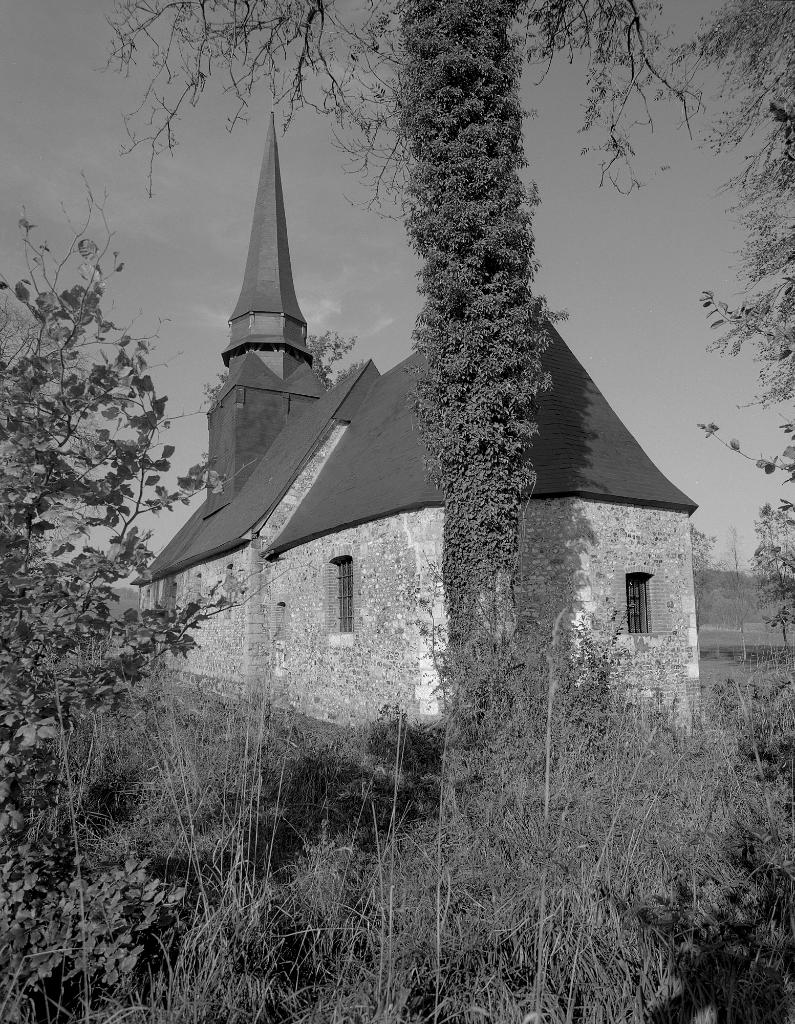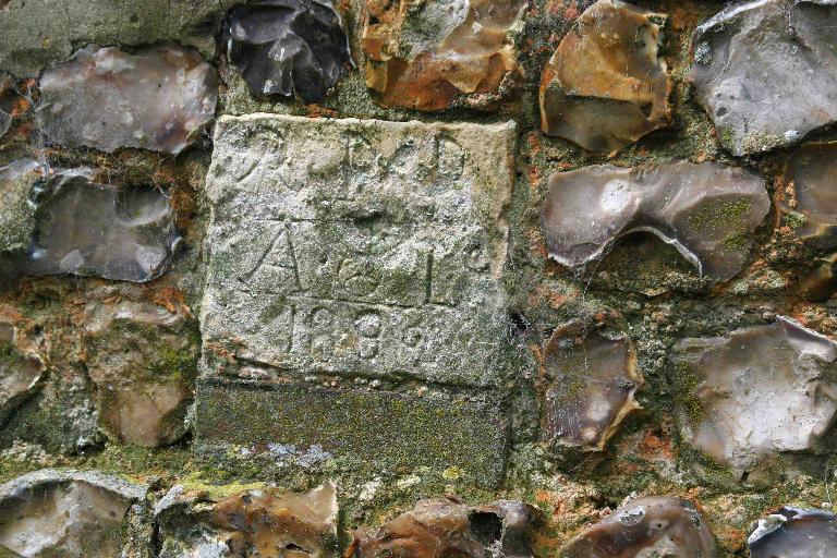 Chœur : silex en rognon dégrossis, tableaux et linteaux de fenêtres en briques rouges. Rebâti au 18e s., se termine par un chevet à trois pans qui est réparé en 1882. On note quelques remploi de pierres tuffeuses provenant de l'ancienne église. Ces pierres ont été utilisées aux 11e et 12e siècles, avant que le tuf, issu de sources pétrifiantes, ne commence à devenir rare et soit progressivement remplacé par le grès au XIIIe siècle. Cartouche avec inscription : réparée par A L 1882, date de 1775 (graffiti). Ancienne porte murée, remaniée et transformée en baie.