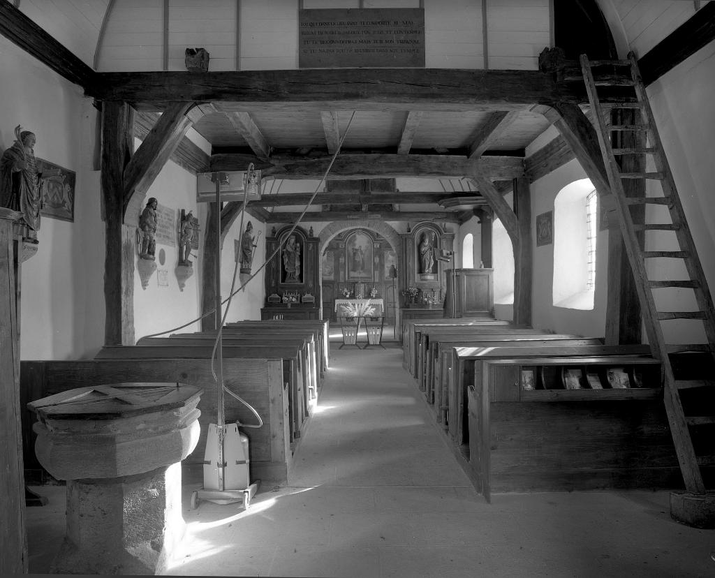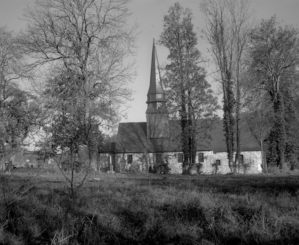 Nef : côté nord, les trois premières travées sont aveugles, deux baies en arc surbaissé ébrasées vers l'intérieur ouvertes dans les travées 3 et 4, dont celle abritant le vitrail 16e s. Sud : quatre baies en arc surbaissé ébrasées vers l'intérieur à intervalles irréguliers. Clocher : en charpente assis dans l'avant dernière travée de la nef, supporté par poteaux et entraits. La chambre du clocher, entièrement close, emplit la partie médiane de la nef (3e travée). On accède au clocher par une petite porte latérale. Chœur : une travée droite. Deux baies en plein cintre de chaque côté, une petite baie au cintre surbaissé, vestige d'une porte condamnée. Chevet : à trois pans. Sacristie.