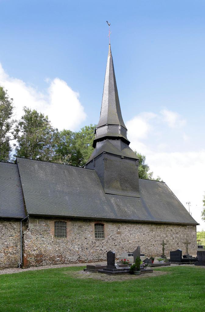 Nef : à quatre travées. La nef est construite en moellons et silex, chaînages de grès et de calcaire. La première travée de la nef et le pignon présentent un appareil en damier de grès de Saint-Valéry et de silex taillés. Silex gris dans les trois autres travées de la nef, emploi du grès dans ces dernières au solin et aux tableaux de fenêtres seulement. Traces de contreforts au sud et au nord entre les fenêtres deux, trois et quatre. Fenêtre trois : jambages et arc en brique. Côté sud : maçonnerie homogène, silex taillés appareillés régulièrement. baies du 16e s. remaniées au 18e s. Arcs surbaissés. Coté nord : mêmes caractéristiques qu'au sud, mais avec seulement deux baies ouvertes.