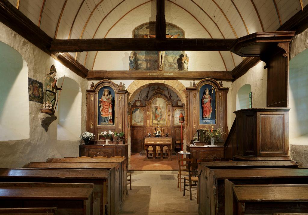 Une importante couche de mortier couvrait les murs au 19e siècle, ne laissant qu'entrevoir les litres funéraires. Un fragment de peintures murales, probablement du 16e siècle, subsiste derrière l'autel secondaire, au sud.