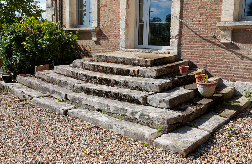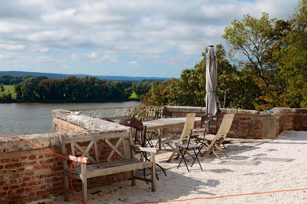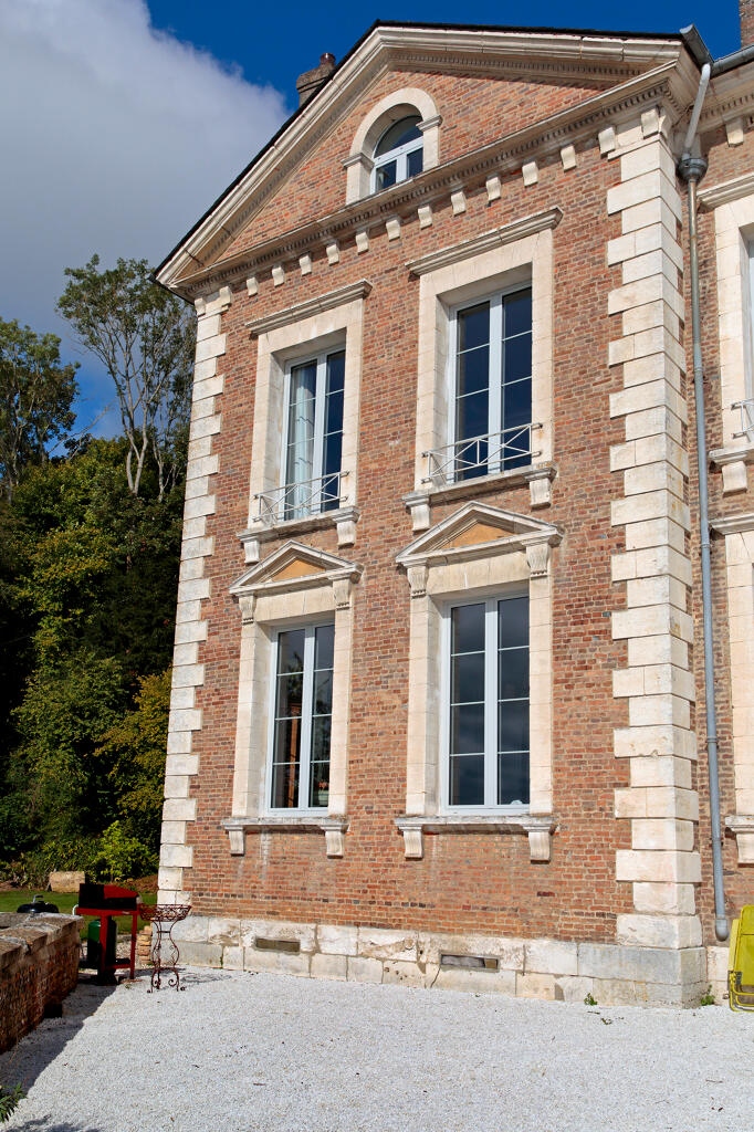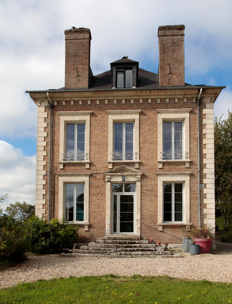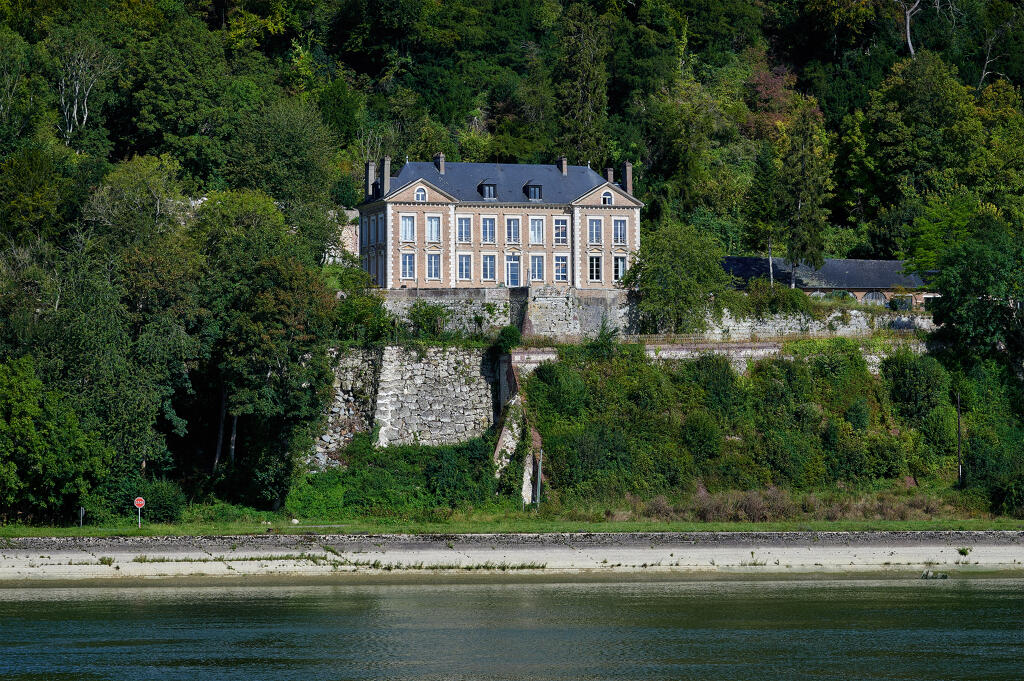 Juchée sur un promontoire rocheux, renforcé par un mur de soutènement en pierre, la demeure domine la Seine de quelques dizaines de mètres. Sa façade principale de style néoclassique, ordonnancée et symétrique, est ainsi bien visible depuis la rive gauche du fleuve. Construite en brique et chaînages harpés en pierre de taille calcaire, elle s'élève en rez-de-chaussée surélevé sur un sous-sol, un étage carré et un étage de comble. Le corps central, divisé en cinq travées, est encadré par deux ailes en légère saillie contenant deux travées chacune et surmontées d'un fronton triangulaire contenant une baie en plein cintre. L'étage de comble est éclairé par deux autres lucarnes sur la partie centrale. Un soin particulier est apporté aux appuis de fenêtres et linteau de forme triangulaire. Le toit en croupe est couvert en ardoise.