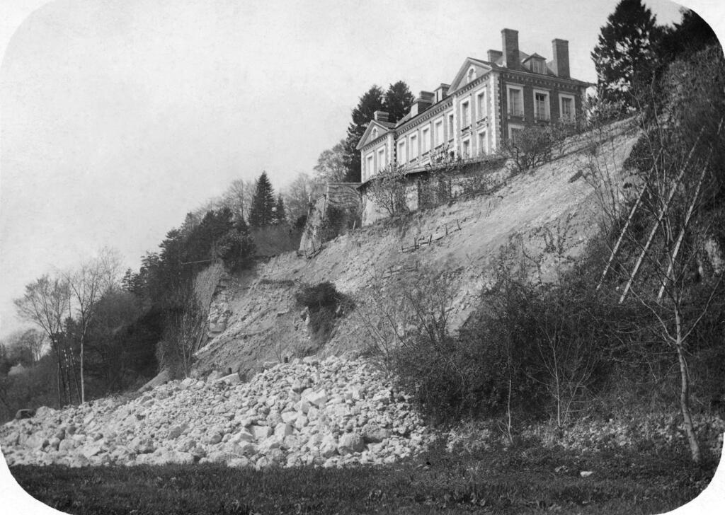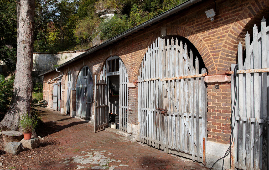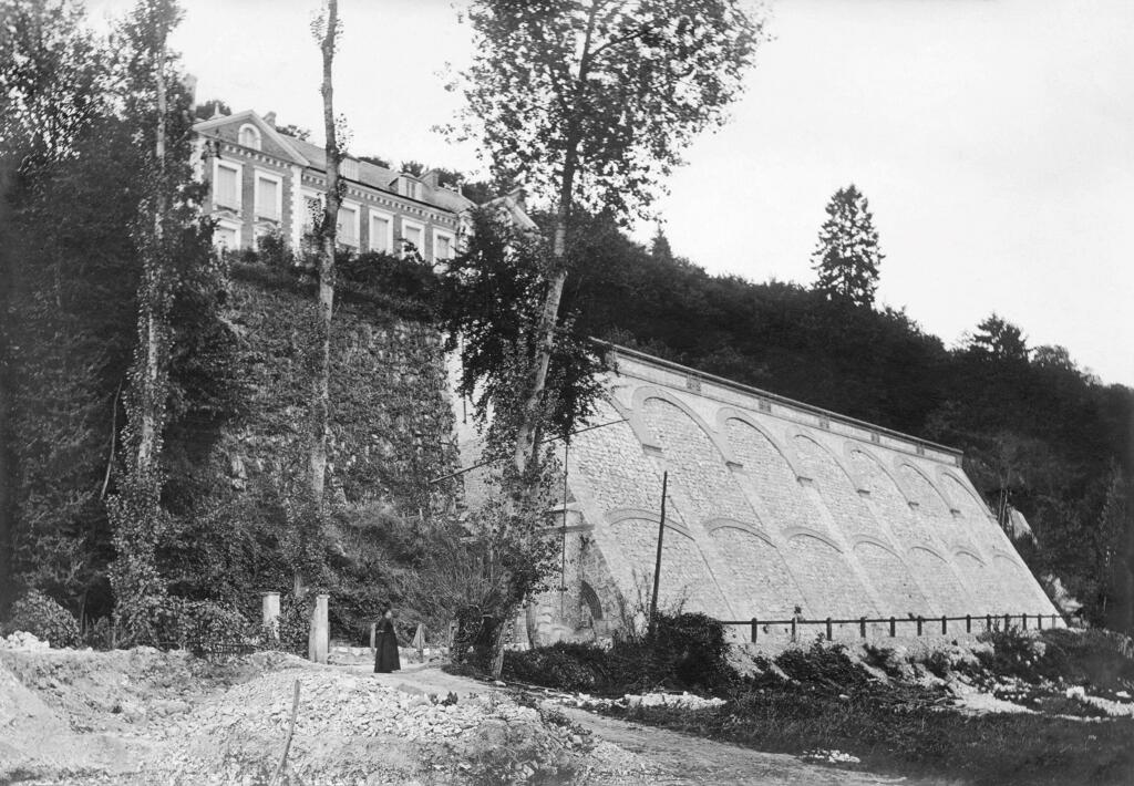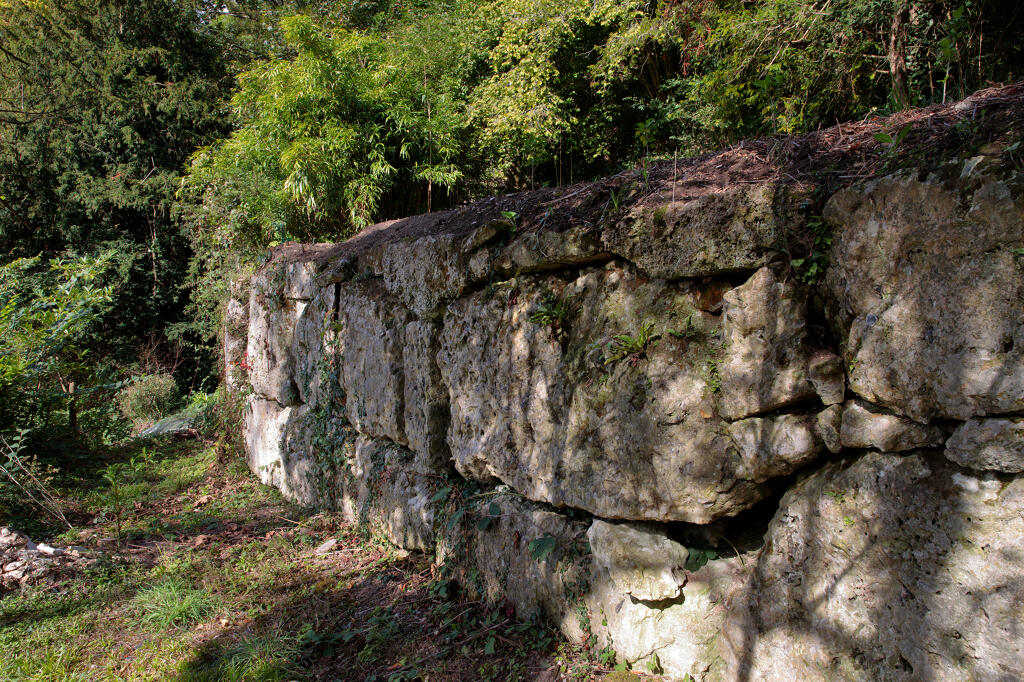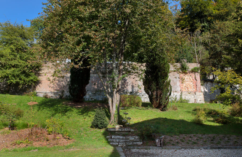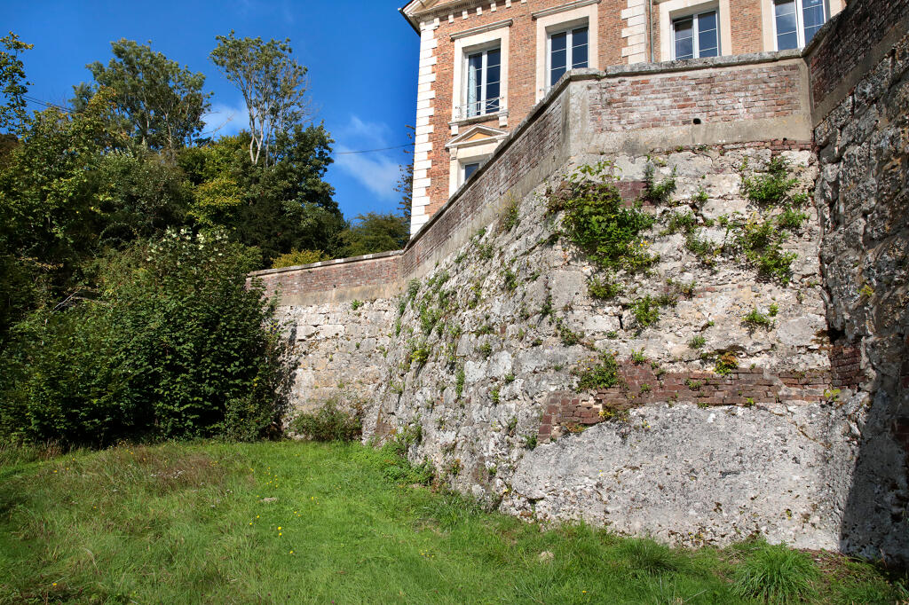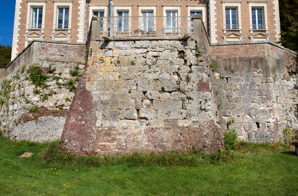 En prolongement du mur de soutènement, un mur dit "romain" est constitué de gros blocs rocheux monolithes. Le chemin de Barre-y-Va, permettant de rejoindre les hauteurs de la commune de Saint-Arnoult et du hameau de La Guerche, longe le mur nord de la propriété. L'ancienne hêtraie avait été plantée par les propriétaires du château. La "pierre tournante" est encore visible au sein des falaises calcaires qui dominent le chemin. Plus haut, l'ancienne maison du jardinier photographiée en 1900 est actuellement à l'état de ruines. Un jardin potager et des serres occupent une partie de la terrasse supérieure qui s'élève au nord de la propriété.
