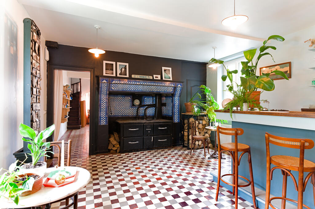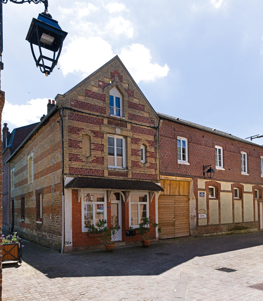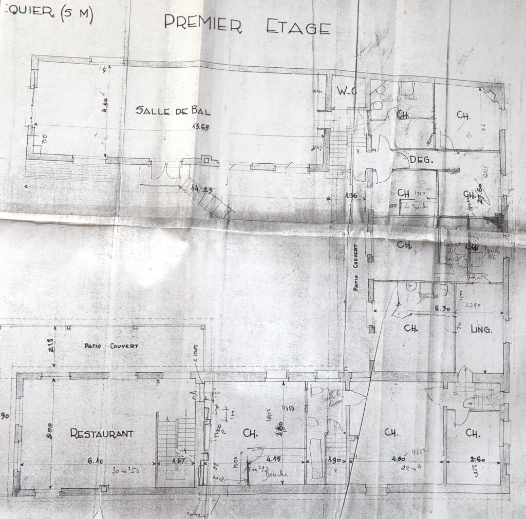 Le premier étage est mis en évidence par un balcon filant muni d'une balustrade en fer forgé, abrité par un lambrequin en bois, fixé sous la corniche du toit. Une large baie de style Art déco avec jardinière en ciment intégrée a été pratiquée au rez-de-chaussée du pignon sud. La façade arrière de l'établissement laisse apparaître des pans de maçonnerie plus ancienne (en assises alternées de moellon calcaire et brique artisanale) et un pignon découvert donnant sur la rue Ernest Binet. Le bâtiment fermant le côté ouest de la cour s'élève en brique industrielle sur une construction antérieure, tandis que le bâtiment au nord a été étendu au rez-de-chaussée, désormais surmonté par un auvent, ce qui a permis d'ajouter un balcon à l'étage. Les toits sont couverts en ardoise. Le décor intérieur de l'établissement a été préservé par l’actuel propriétaire des chambres d’hôtes de la Maison plume.