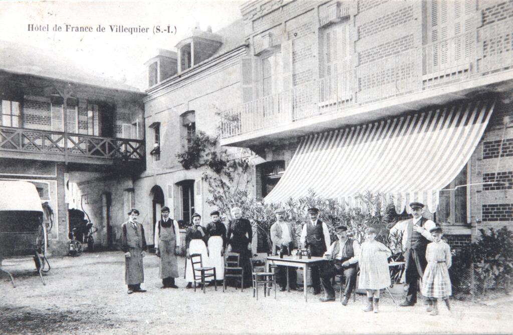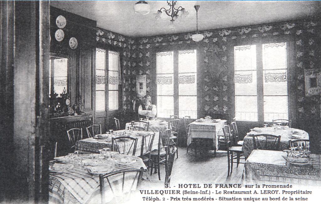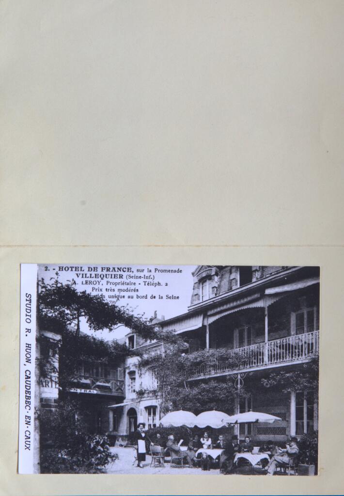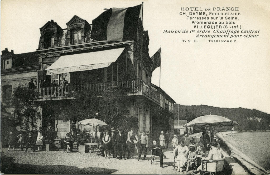 Une carte postale des années 1920 représentant la terrasse de l'Hôtel de France à Villequier indique CH. DAYME, PROPRIÉTAIRE.