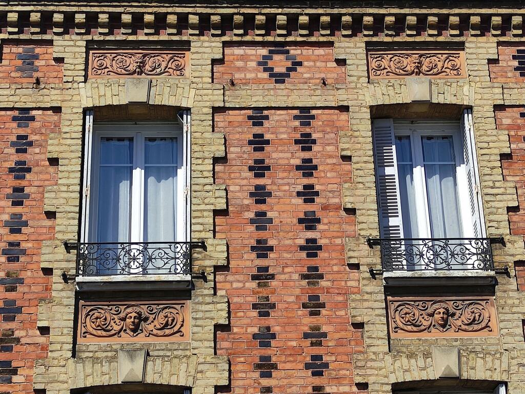 L'emploi de briques de différentes teintes (grège, émaillée...) permet d'animer la façade en créant des effet de chaînages harpés, des motifs de losanges au niveau de la corniche et des frises de croix entre les travées. Les allèges de fenêtres contiennent des plaques en terre cuite qui sont scellées dans la maçonnerie et décorées de mascarons sculptés de têtes de femme ou de créatures fantastiques ou mythologiques au milieu de rinceaux et ornements végétaux. Chaque baie est munie d'un garde-corps en fer forgé très ouvragé. La façade est et le pignon nord sont simplement maçonnés en assises alternées de brique et de silex. La toiture en croupe est couverte en ardoise.