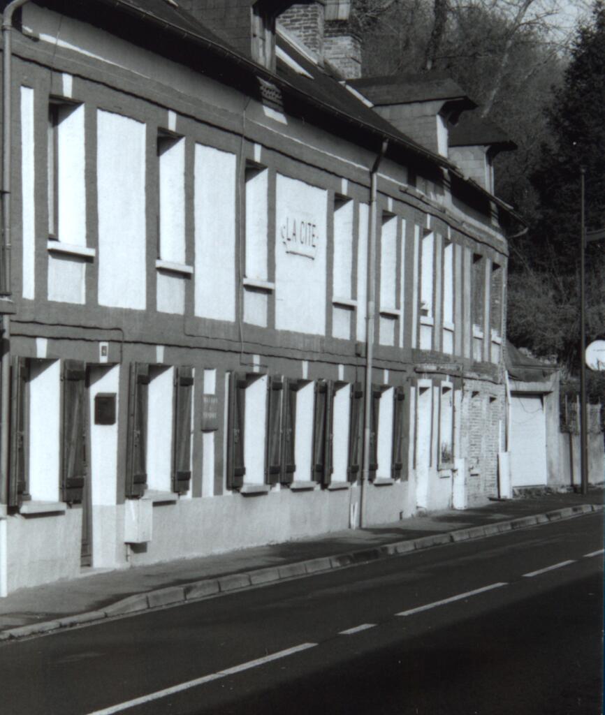 Les logements en enfilade sont réunis dans un même bâtiment qui se déploie sur plusieurs travées et s'élève sur un étage carré et un étage de comble (éclairé d'un côté par des velux, de l'autre par des lucarnes à croupe). Les murs sont maçonnés en silex enduit avec des chaînages en brique. Le toit à longs pans est couvert en ardoise. La porte du logement central est surmontée de l'inscription "LA CITE" (gravée dans un cartouche).
