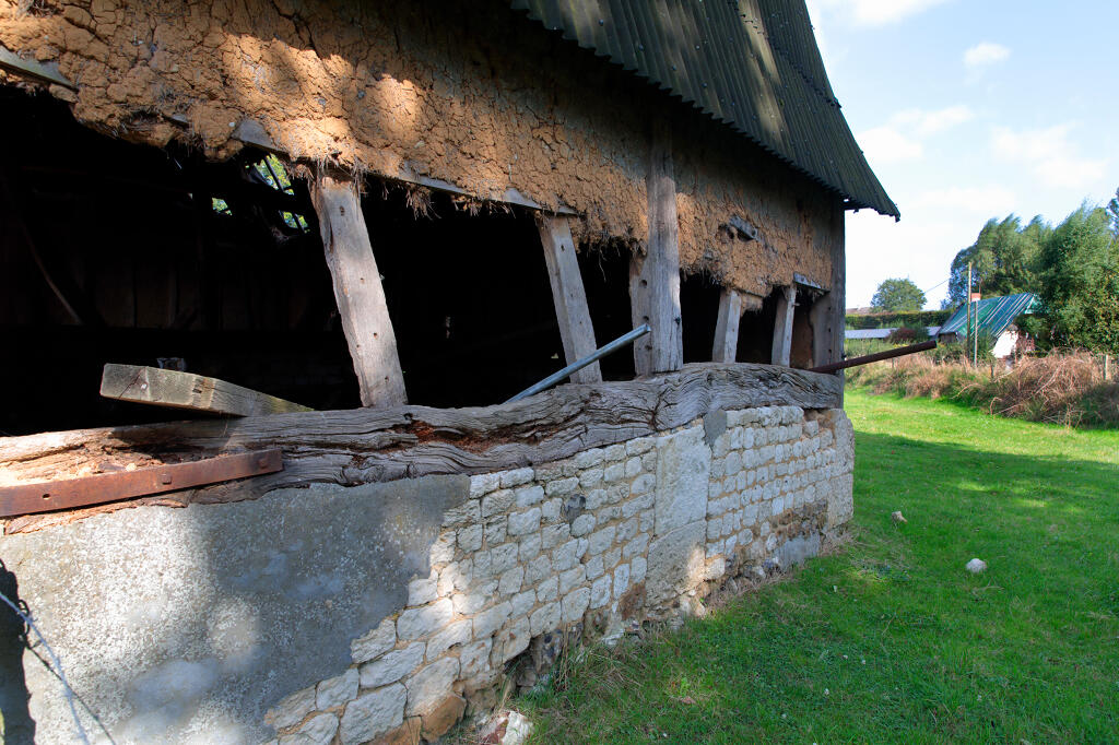 - la charretterie et le four à pain sont des bâtiments assemblés en pan de bois sur un soubassement en brique et silex et désormais couverts de tôles ondulées. L'ouverture du four en brique et moellon calcaire qui a été comblée est encore bien visible depuis l'intérieur du bâtiment.