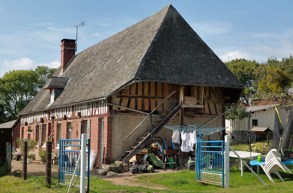 - La maison de ferme est une longère en pan de bois et torchis, dont la façade principale a été en partie remontée en brique postérieurement. Le surcroît du comble laisse apparaître des croix de Saint-André. Le toit en croupe est couvert en ardoise et percé en son centre d'une petite lucarne. La queue-de-geai abrite un escalier extérieur donnant accès au comble sur le pignon est.
