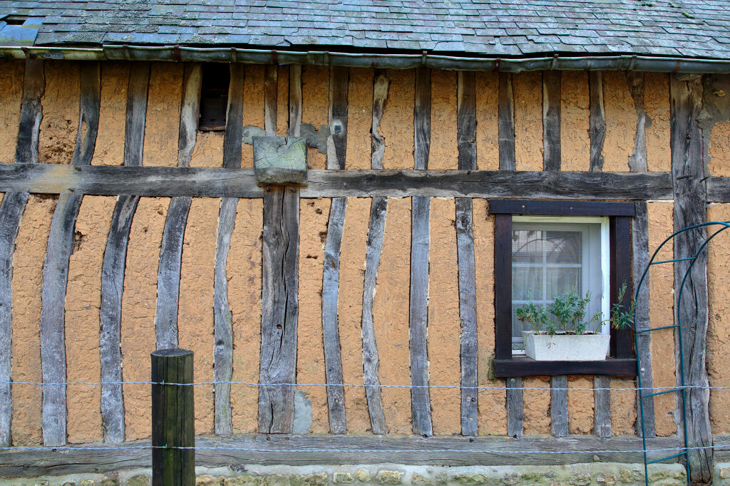 - Le pressoir est construit en pan de bois et torchis sur un épais soubassement en pierre calcaire et silex. Les murs sont couverts de tôles ondulées, de même que le toit en croupe dont la forme indique qu'il était autrefois couvert en chaume.