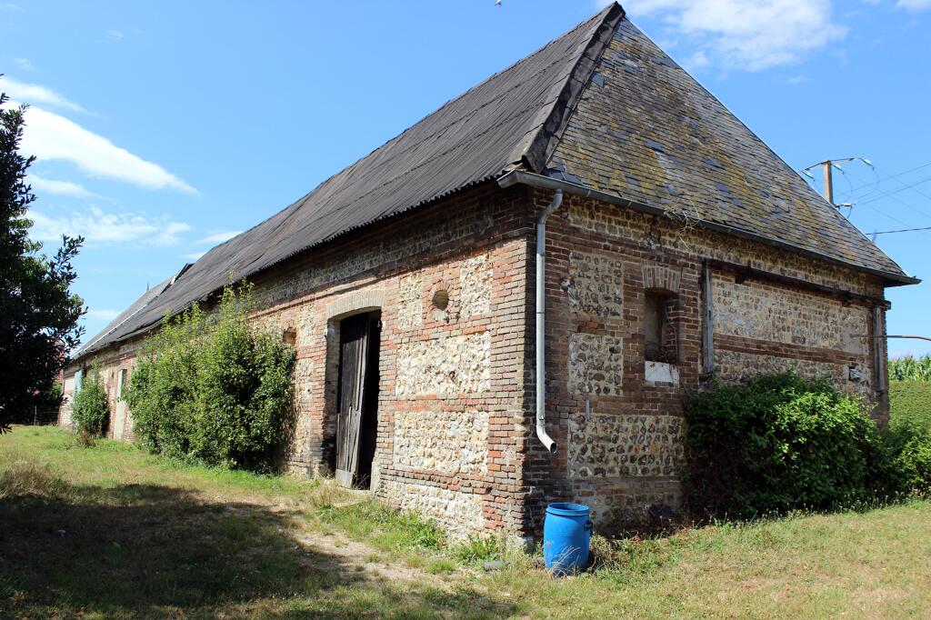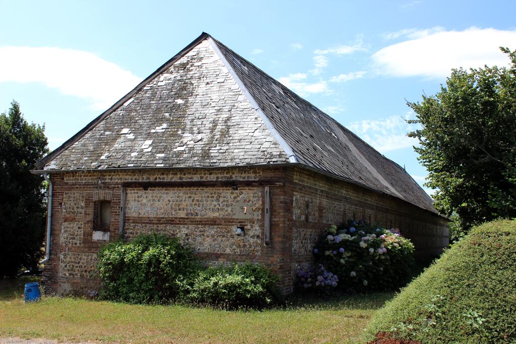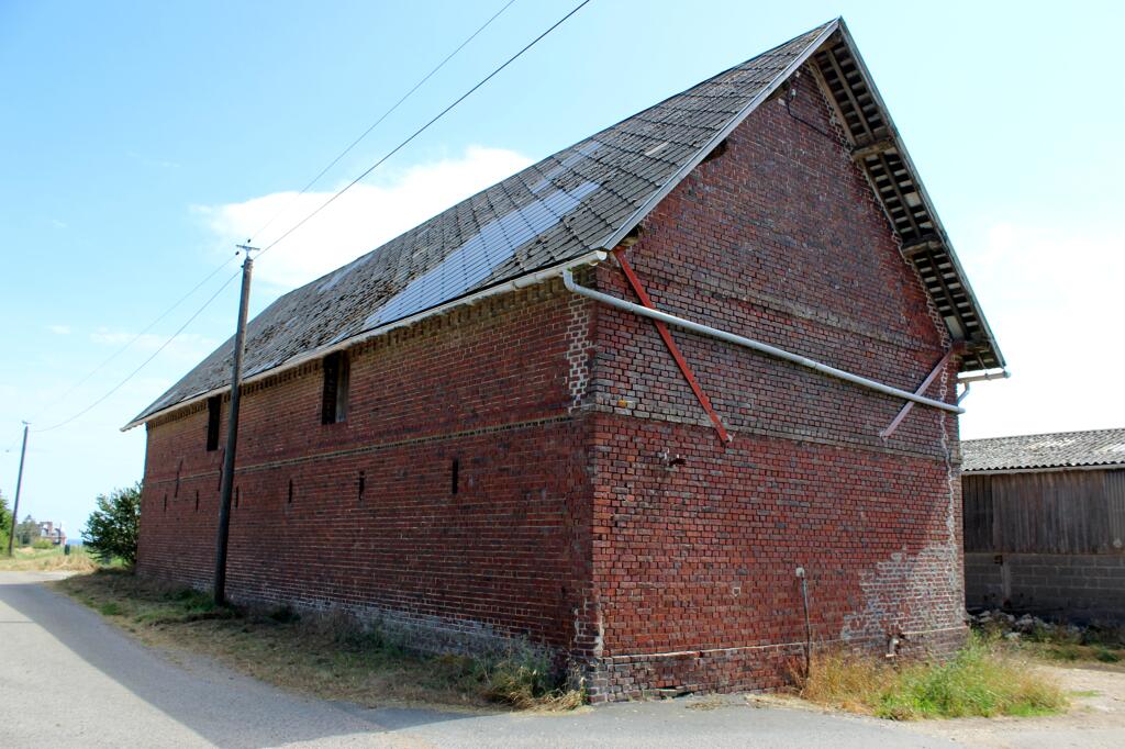 La grange, intégralement construite en brique industrielle, est couverte en ardoise fibrociment. L'étable est bâtie en maçonnerie de silex et chaînages en brique. Le toit en croupe est partiellement couvert en ardoise et en tôle ondulée.