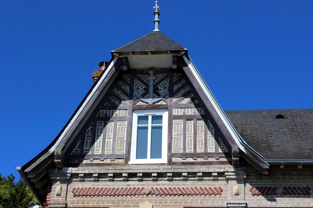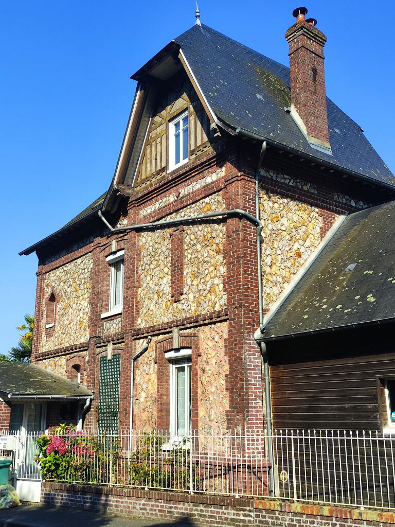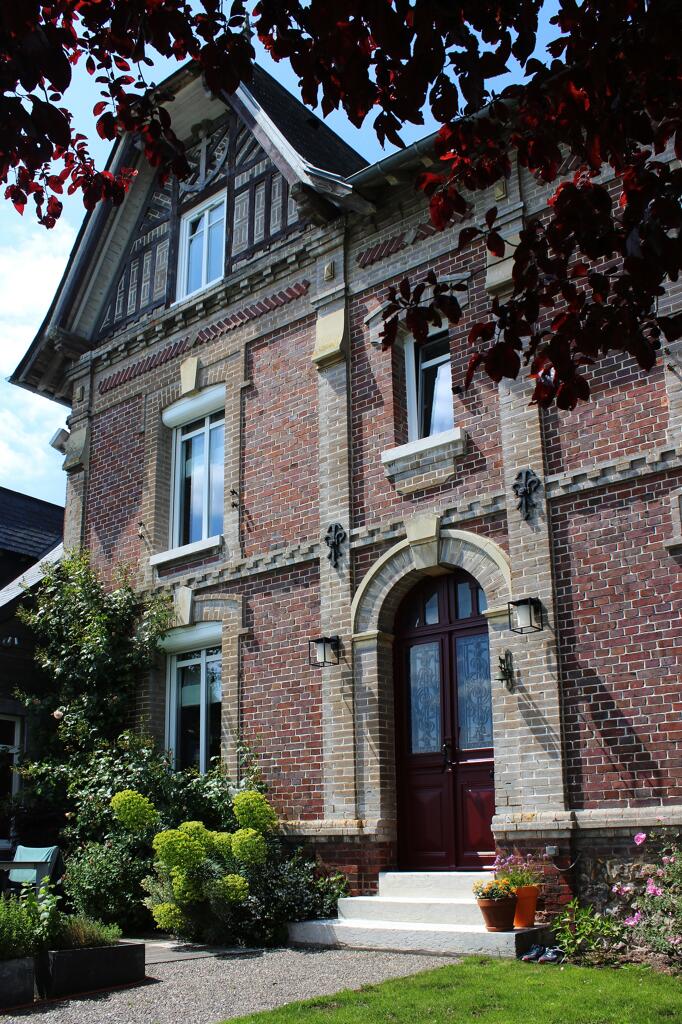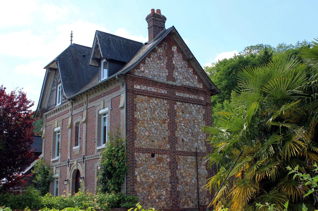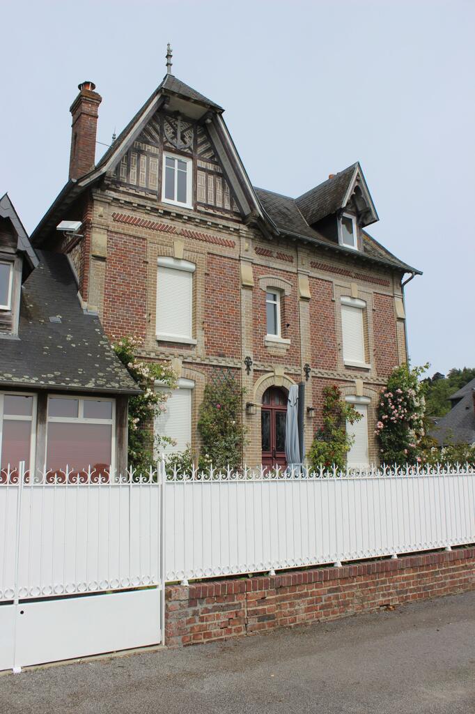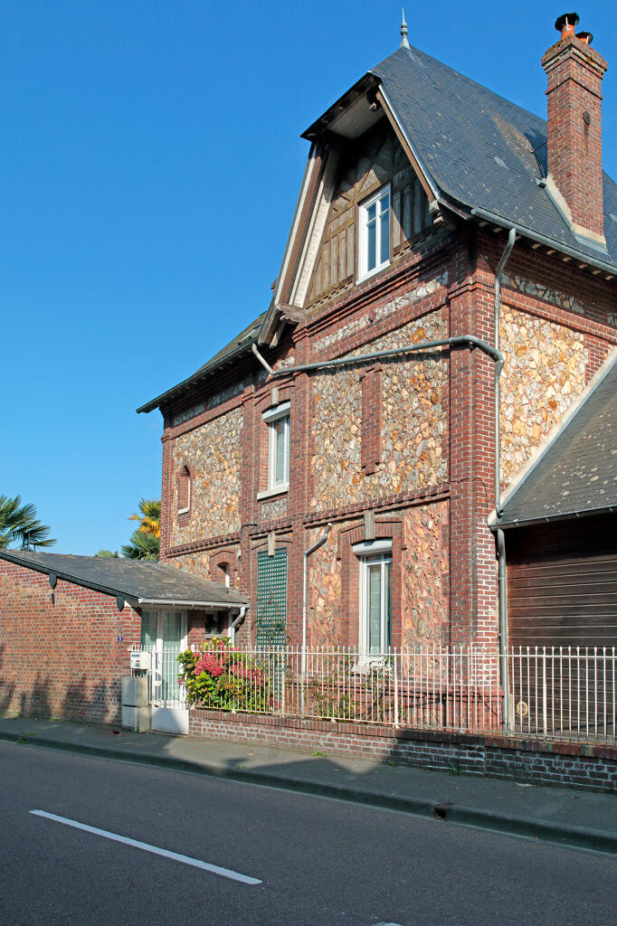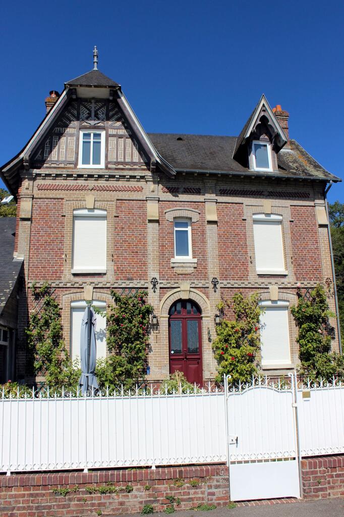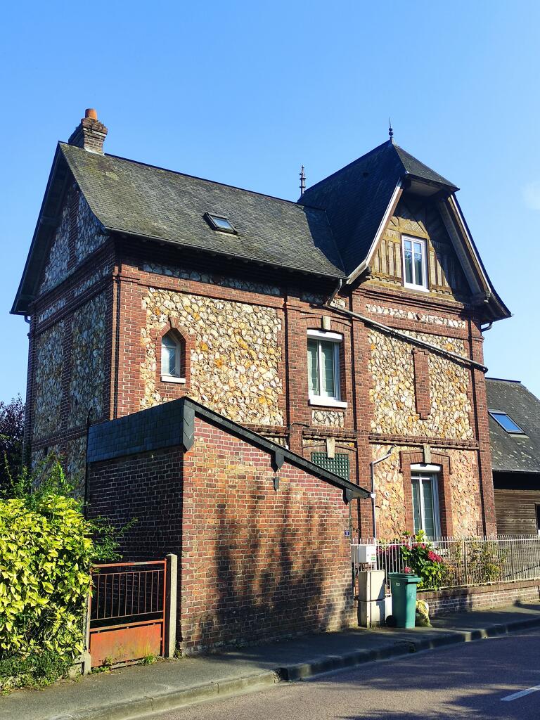 La demeure en brique est édifiée face à la Seine. Sa façade principale, divisée en trois travées, s'élève sur un étage carré et un étage de comble. Les chaînages d'angle et d'ouverture sont rehaussés par l'emploi de briques de teinte gris-beige. Les pignons sont maçonnés en silex et chaînages de brique. La corniche à denticules est soulignée par un bandeau décoratif de briques, disposées à champ et en oblique, rappelant un motif de cordage. La porte d'entrée en plein cintre, rehaussée de quelques marches, prend place dans la travée centrale. L'étage de comble est éclairé d'un côté par une lucarne à chevalet au motif trilobé, de l'autre par une demi-croupe débordante découvrant un pan de mur en pan de bois et galandage en brique, décoré du côté sud d'une ancre de navire. La toiture est couverte en ardoise.