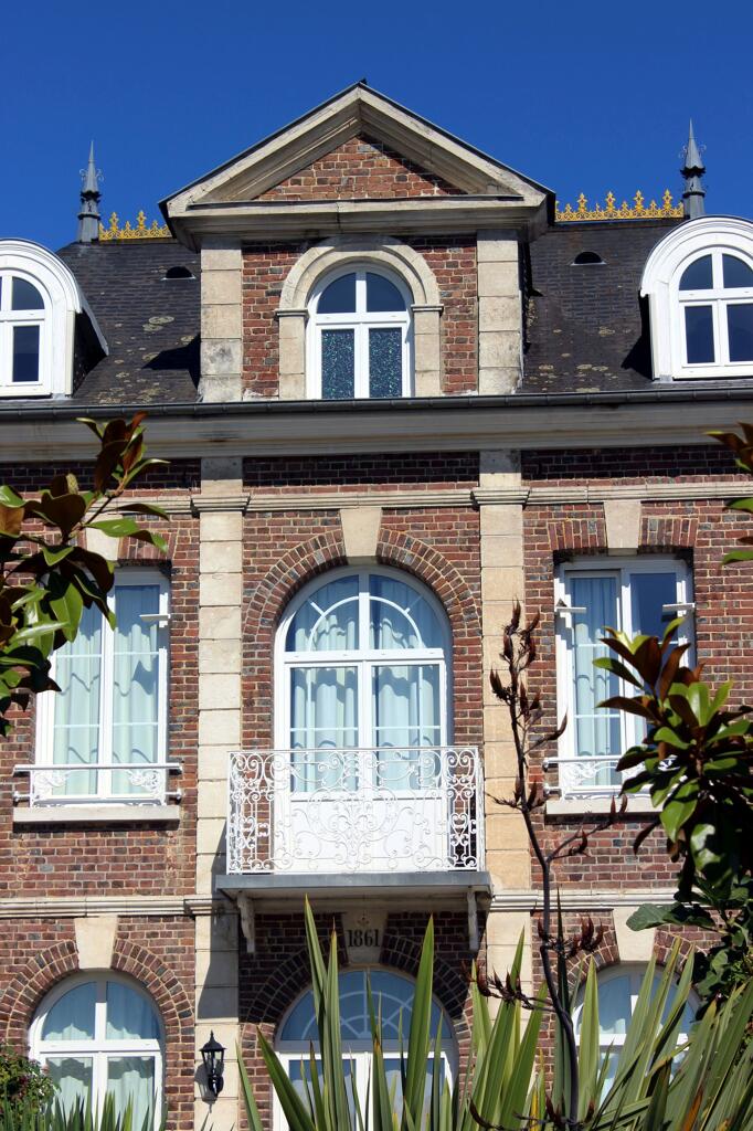 La demeure, précédée d'un jardin d'agrément clôturé d'une grille et d'un muret en brique et silex, se dresse face à la Seine. Sa façade principale, bien ordonnancée, s'élève sur un étage carré et un étage de comble. Elle est maçonnée en brique avec des chaînages d'angle et d'ouverture en pierre de taille. La travée centrale est mise en évidence par sa large porte d'entrée au rez-de-chaussée, surmontée d'un balcon à l'étage et d'une lucarne à fronton triangulaire au niveau du comble.