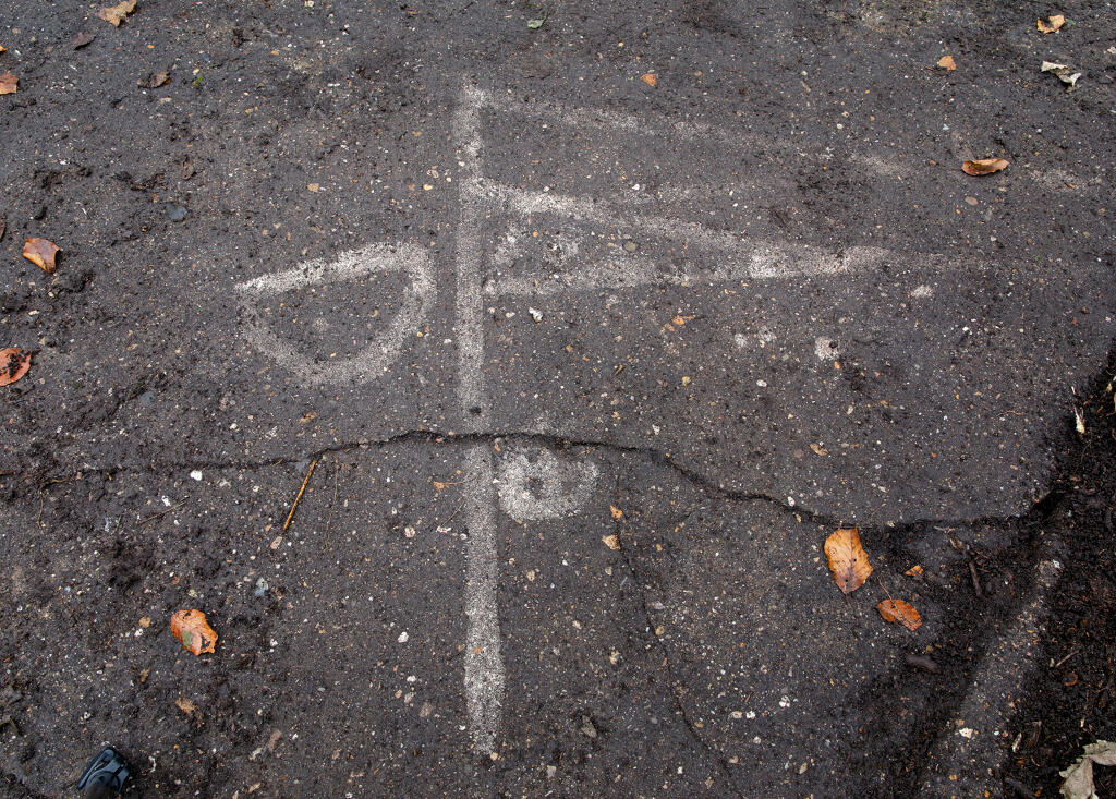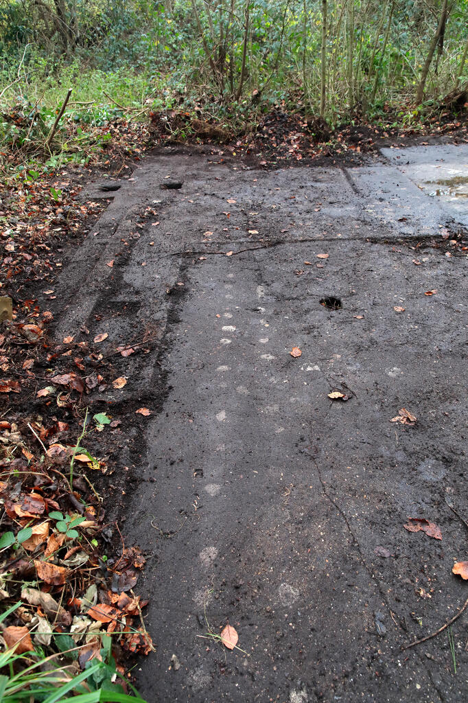 Piste d'accès bétonnée. Orientation NE - SO. Elle permet le roulage du chariot transportant le V1 jusqu'à la dalle amagnétique et son retour jusqu'à l'aire de lancement, prévue à l'est.