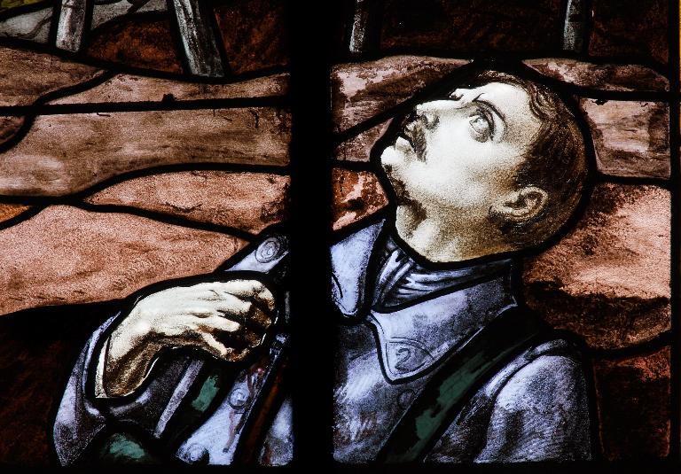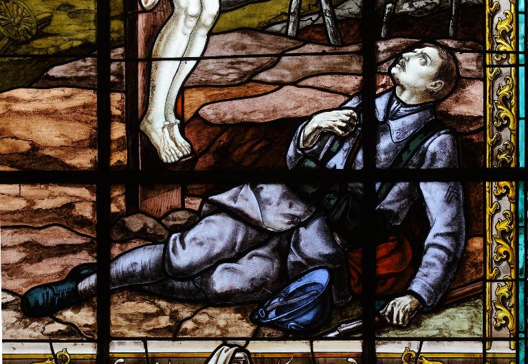 La verrière est réalisée vers 1920, mais elle est non signée et non datée. Outre la position du bras replié sur la poitrine, le soldat est très inspiré de l'estampe de E. Azambre, publié par Schaefer frères (n° 615). De nombreuses œuvres apparentées se trouvent dans toute la Normandie.
