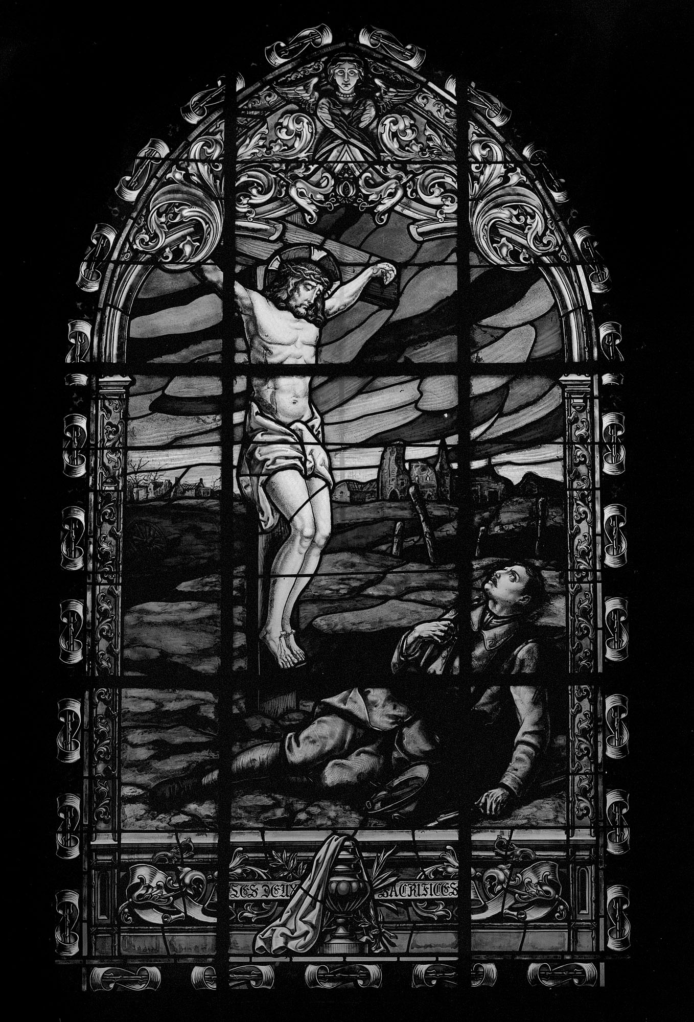 Un Christ en croix apparaît à un soldat mourant, isolé dans une zone de combat désertique. En fond de paysage émerge un village évoquant des ruines du type d’Ablain-Saint-Nazaire (Pas-de-Calais). Les couleurs vives du ciel évoquent un lointain incendie. Les colonnes et l'arc en accolade sont animés de rinceaux de feuilles d'acanthe et surmontés d'une tête d'ange ailée. Au registre inférieur figure une urne funéraire drapée. La bordure est constituée d'une alternance d'enroulements de rubans autour d'une branche végétale et de motifs tréflés rouges.