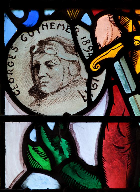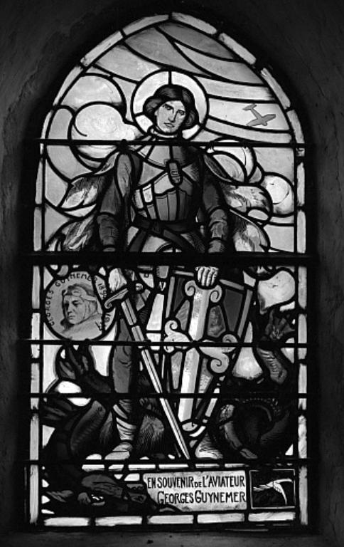 La verrière, non signée, est dédiée à la mémoire de l'aviateur Georges Guynemer (1894-1917) qui vécut jusqu'à l'âge de six ans au Thuit. L’œuvre est inaugurée le 29 juillet 1928. Elle est restaurée par Jean-Pierre Tisserand (Evreux) en 1978.