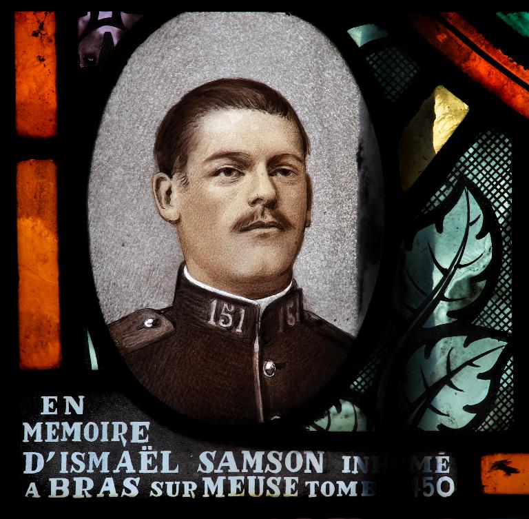 La verrière est réalisée en 1937 par l'atelier Charles Lorin et Cie à Chartres en mémoire d'Ismaël Samson, inhumé à Bras-sur-Meuse (Meuse) le 18 juin 1918. L'atelier Lorin avait réalisé une première verrière pour l'église en 1936.