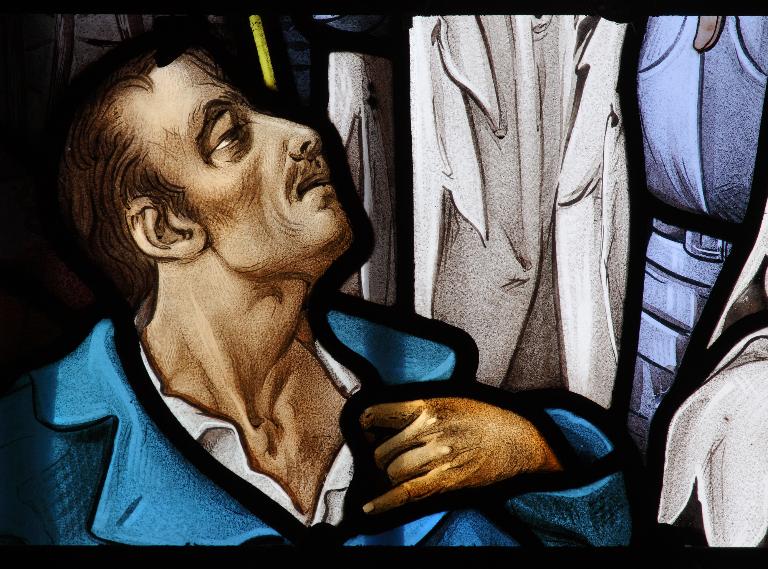 Une lancette à arc surbaissé. Les verres incolores des parties haute et basse sont traités dans goût des panneaux médiévaux. La composition géométrique losangée est animée de rinceaux de feuilles de fraisiers. La bordure est constituée de roses et de feuilles de fraisiers, encadrées de filets orangés.