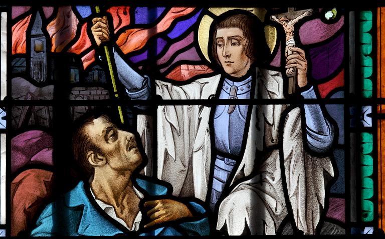 Jeanne d'Arc agenouillée, en armure et surcot blanc, tenant sa bannière en main droite, présente la croix de son martyre à un soldat mourant sur fond d'église en flammes.