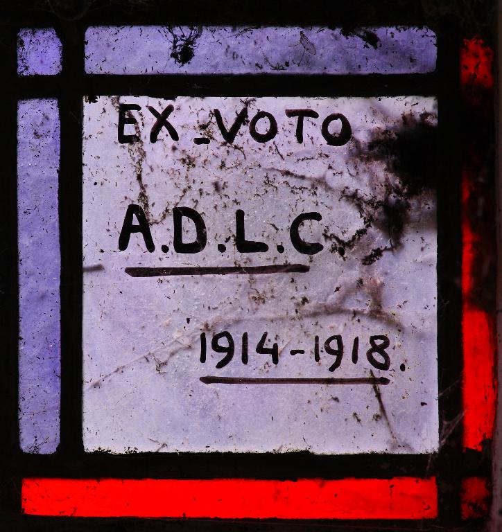La verrière est réalisée vers 1920. Seule une inscription discrète précise l'intention de donation et le lien avec la guerre. Bien qu’atypique dans sa production, le vitrail pourrait être attribué au maître verrier Raphaël Lardeur par analogie avec une autre verrière, présente dans l'édifice et signée.