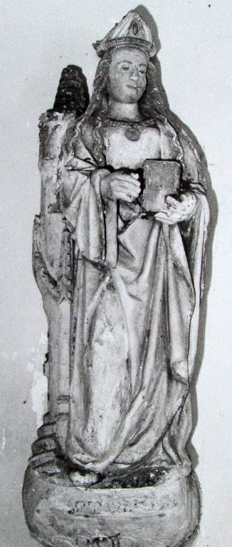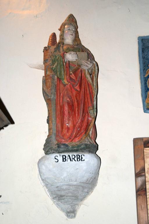 La sainte, en pied, coiffée d'un curieux couvre-chef (mitre ?), est placée à côté de sa tour ; elle tient un livre dans sa main gauche, la palme des martyrs était probablement présente dans sa main droite