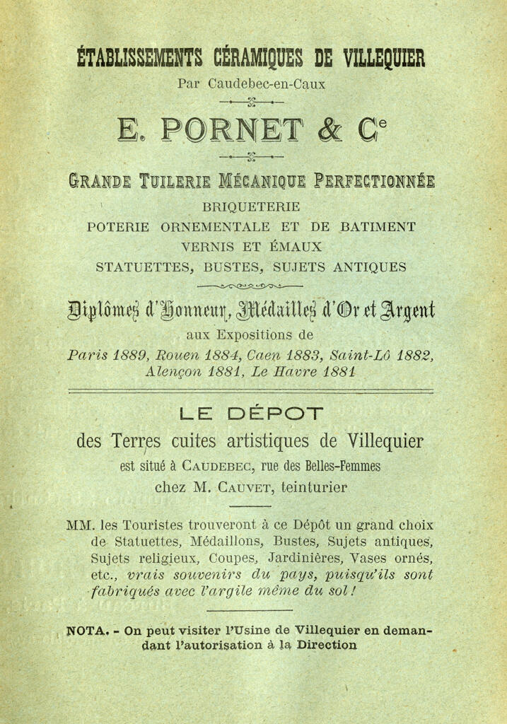 Tuilerie et briqueterie portant le nom de son directeur, Etienne Pornet. La briqueterie tuilerie de Villequier est une filiale de la tuilerie et briqueterie dite "Tuilerie mécanique perfectionnée de Normandie" (Argences, Calvados).