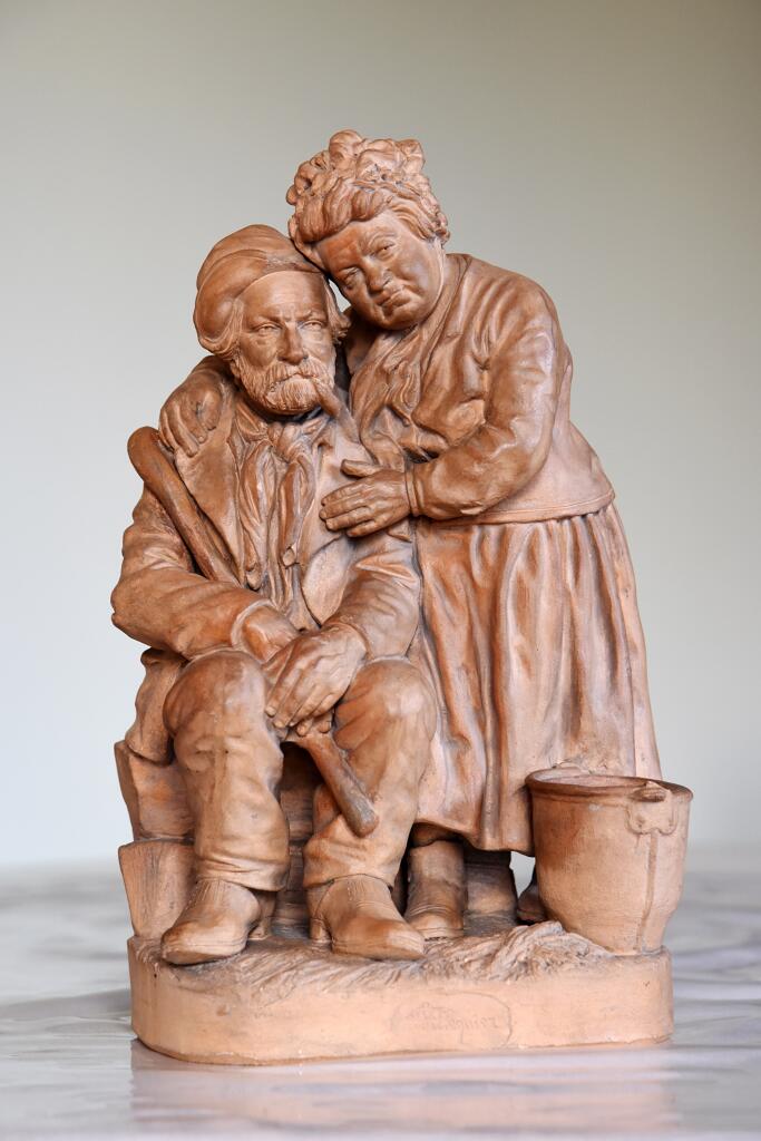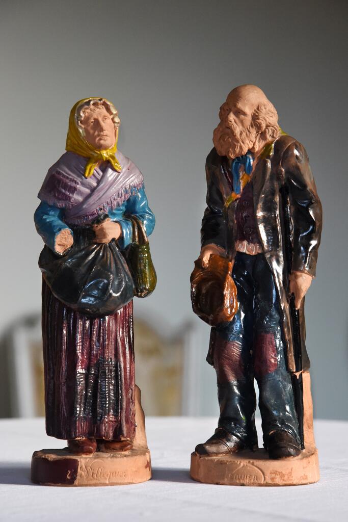 Statuettes en terre cuite, moulées. Dos plat pour le couple âgé. Les sujets représentés sont des modèles réalistes liés à la vie locale et rurale, sujets prisés à la fin du 19e siècle.
