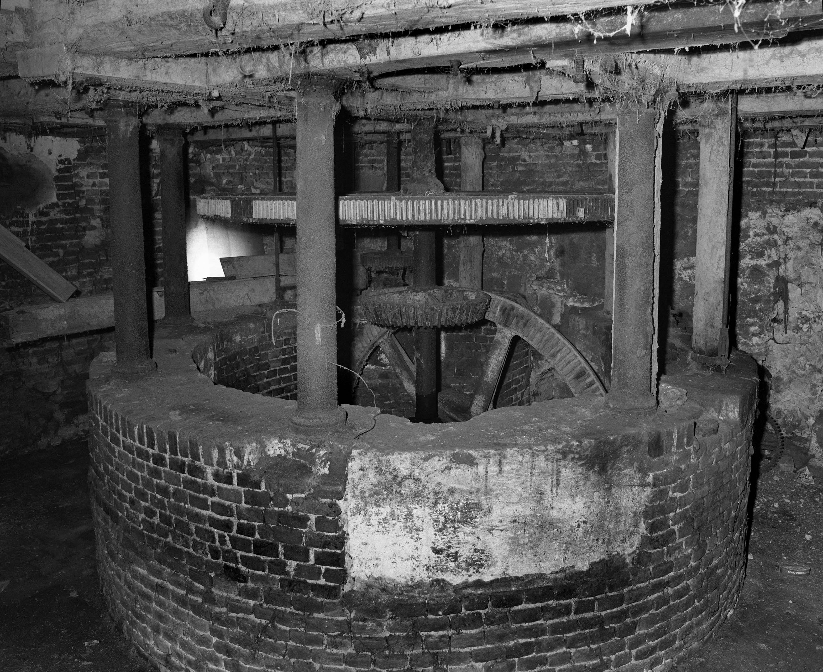 Vue intérieure du moulin, engrenages et axe de transmission de l'énergie.Immatriculation