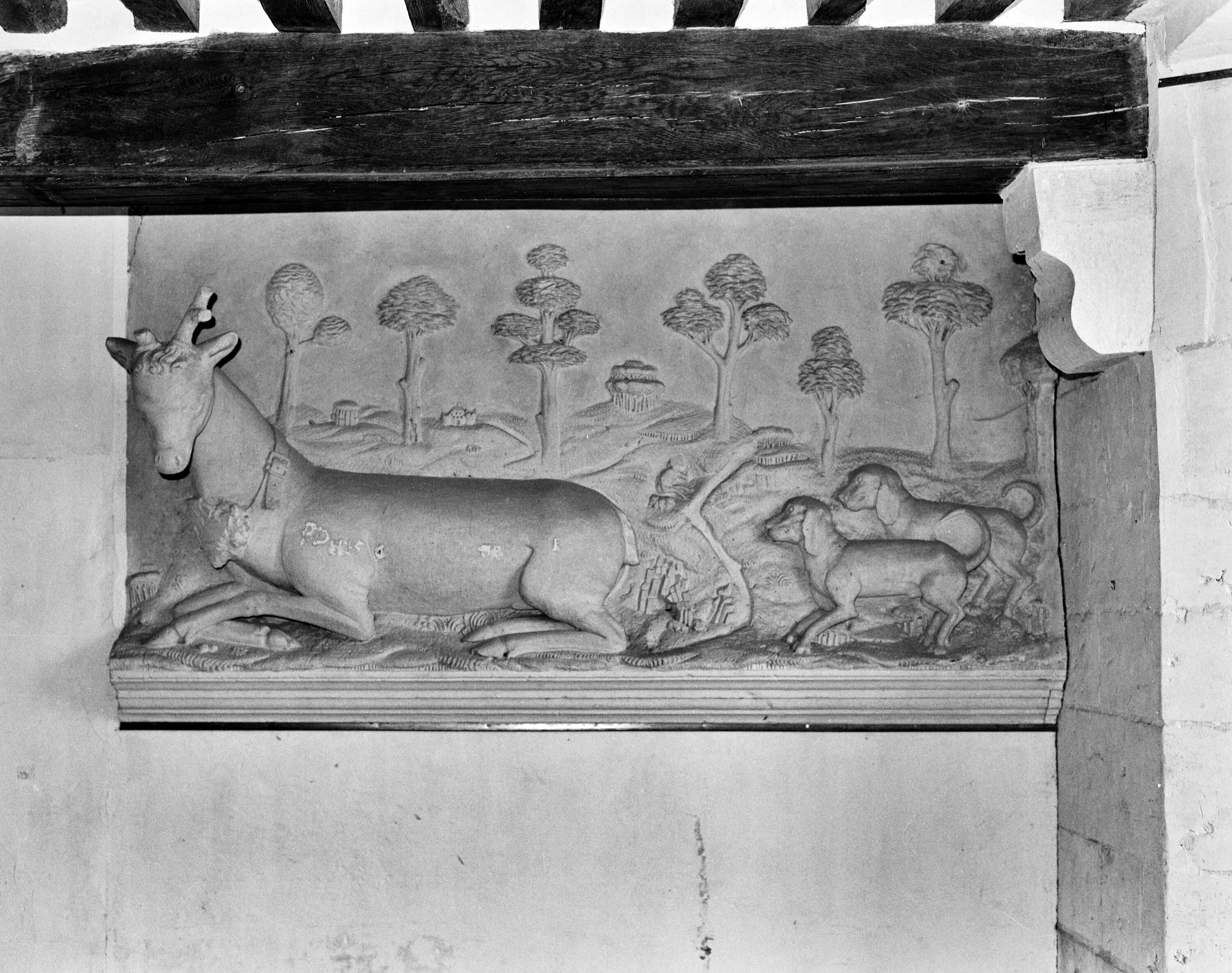 Manoir, rez-de-chaussée, salle à manger, vue d'ensemble du relief au cerf.Immatriculation