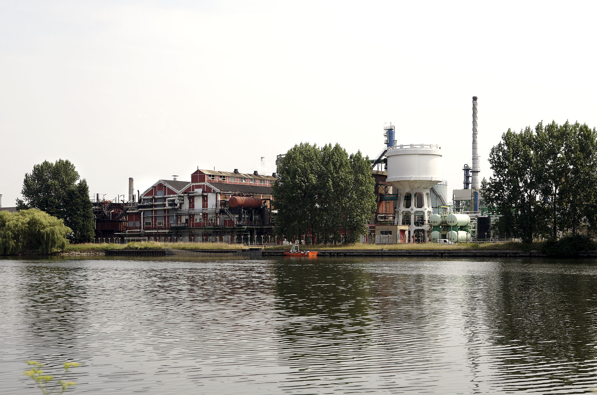 Vue de l'ancienne centrale thermique depuis la rive nord du canal de Tancarville.Immatriculation