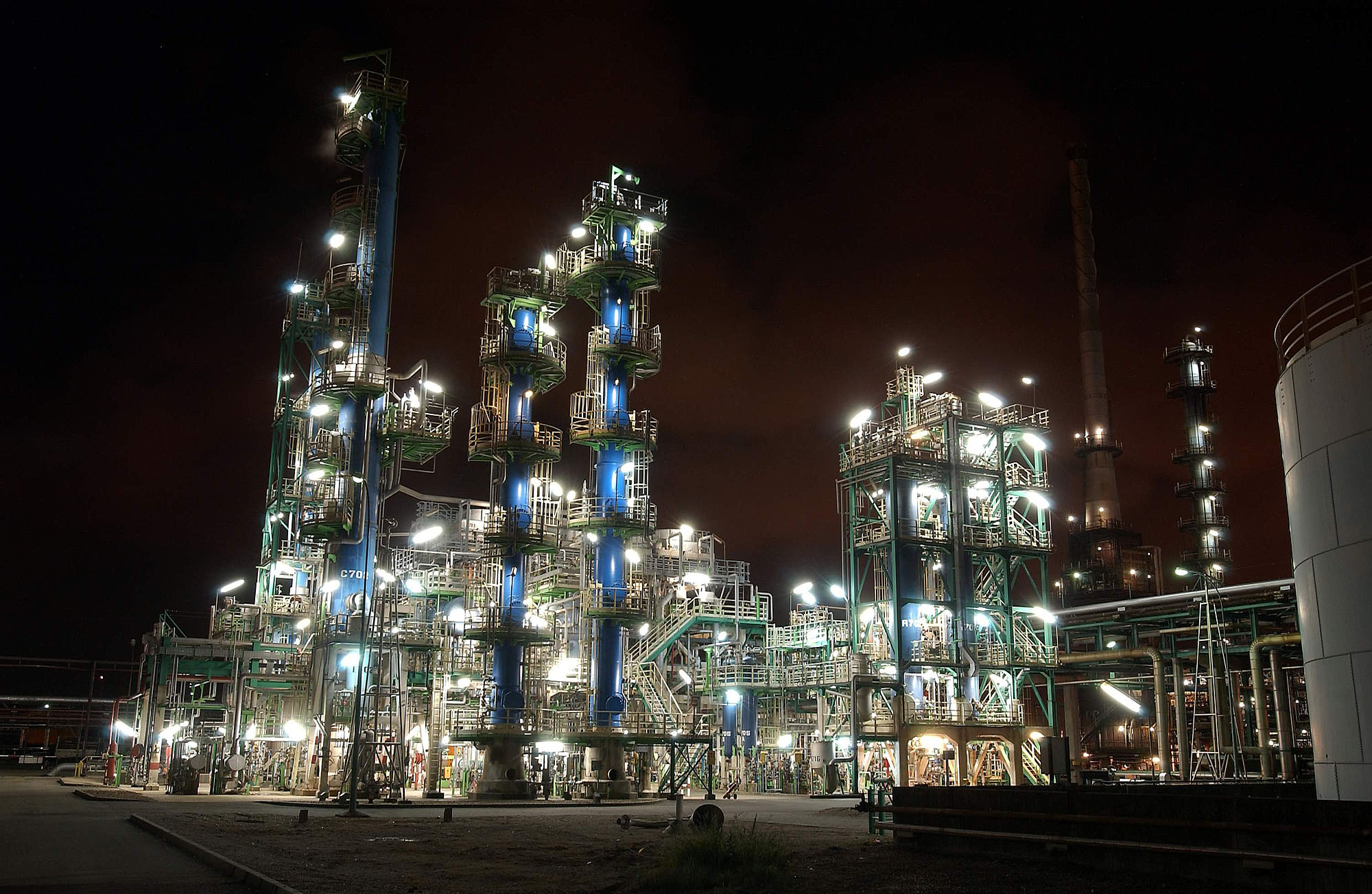 Vue de nuit de l'unité d'isomérisation.-Photographie, cliché Marc Dufour, 2004 (Coll. Total).Immatriculation