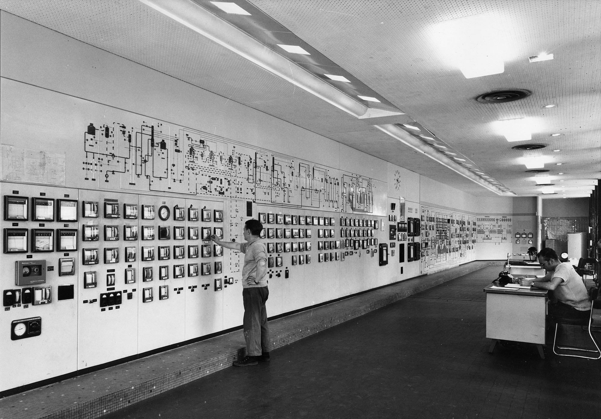 Vue intérieur de la salle de contrôle commune.- Photographie, vers 1970 (Coll. Total).Immatriculation