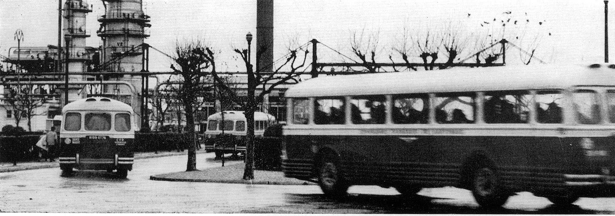 Vue des bus utilisés pour le transport du personnel de l'usine.- Photographie, vers 1950 (Coll. Total).Immatriculation