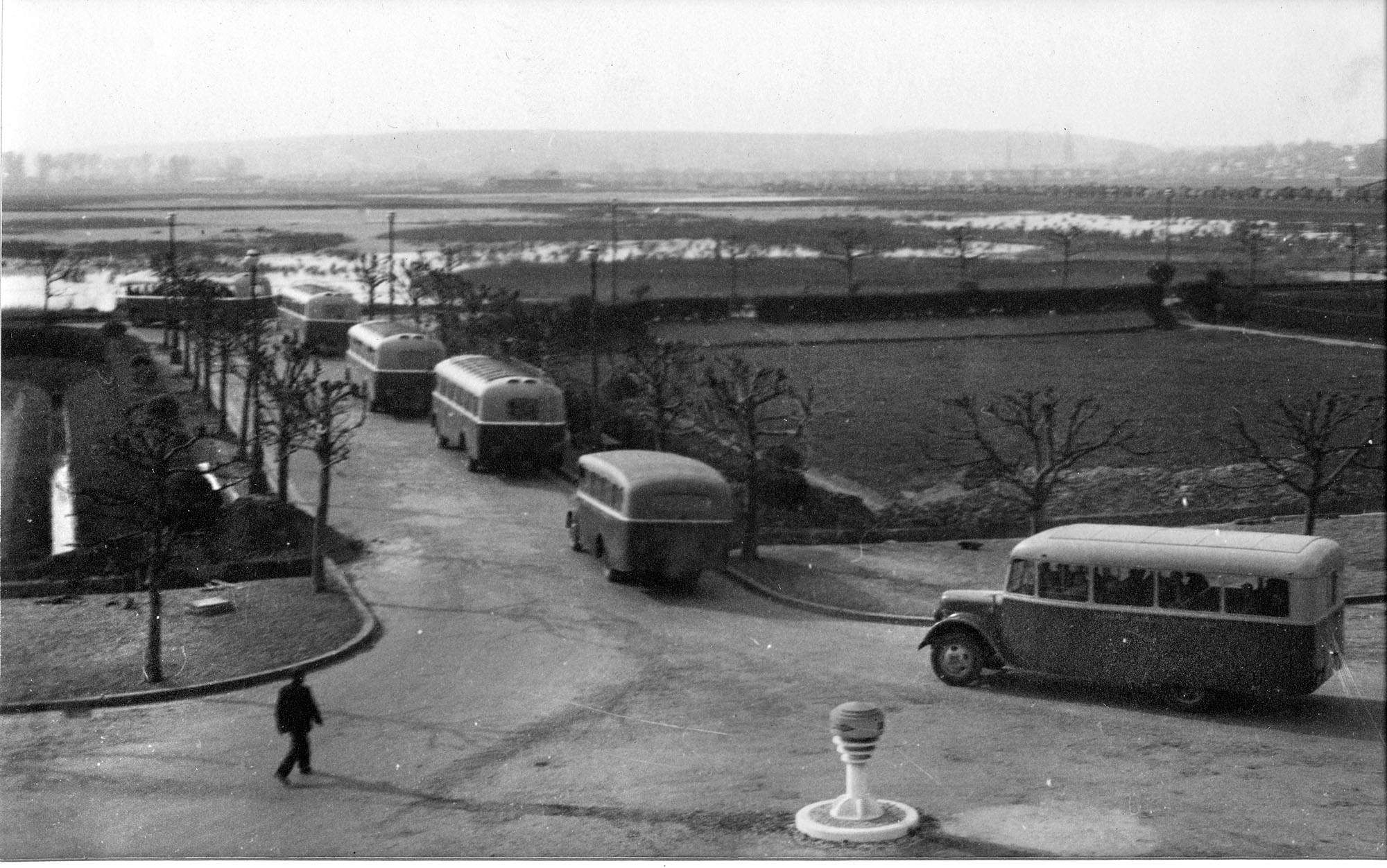 Vue des bus utilisés pour le transport du personnel de l'usine.- Photographie, vers 1950 (Coll. Total).Immatriculation