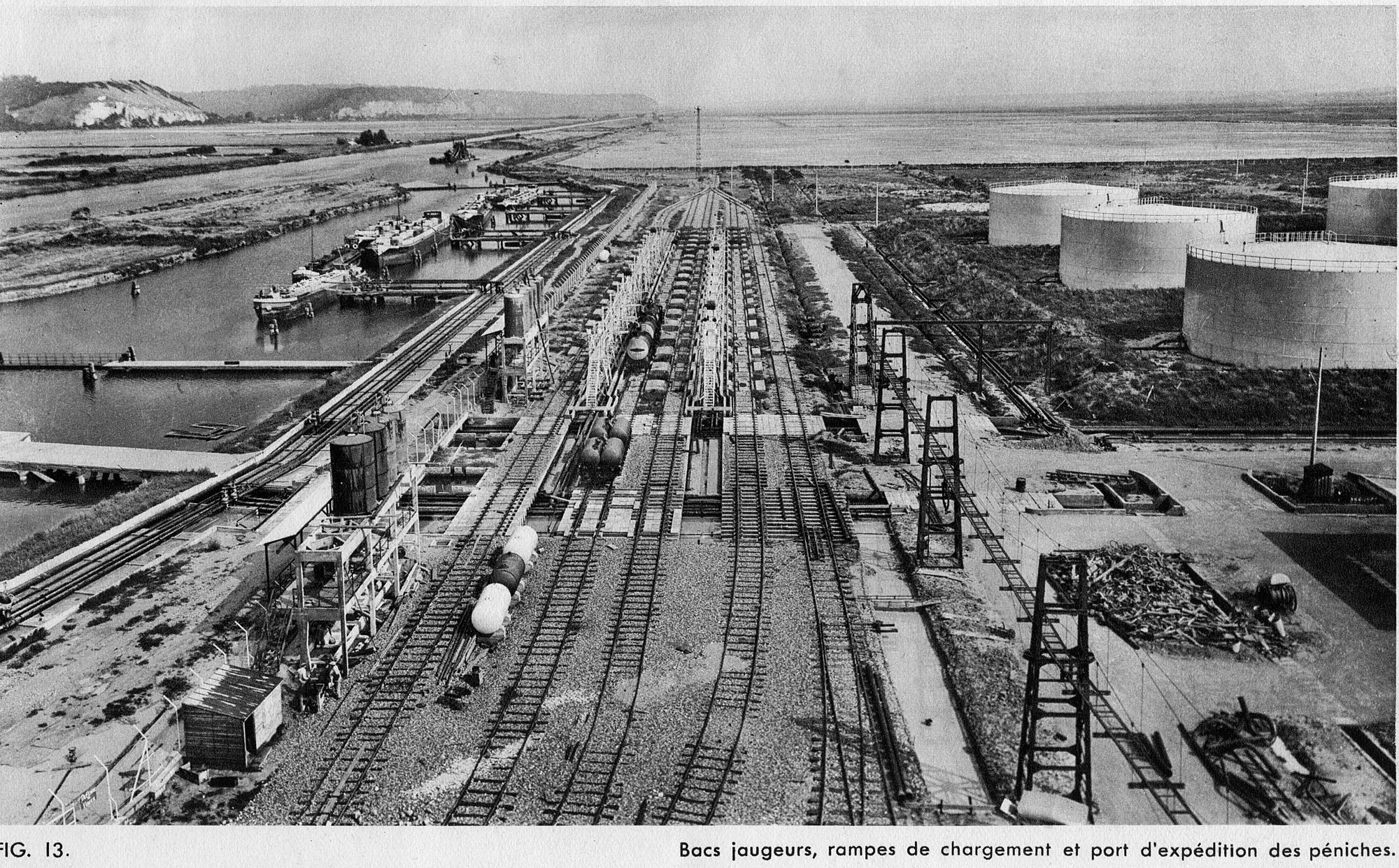 Vue des bacs jaugeurs, des rampes de chargement, du réseau rerré et du port d'expédition sur le canal de Tancarville, 1933 (Coll. Total).Immatriculation