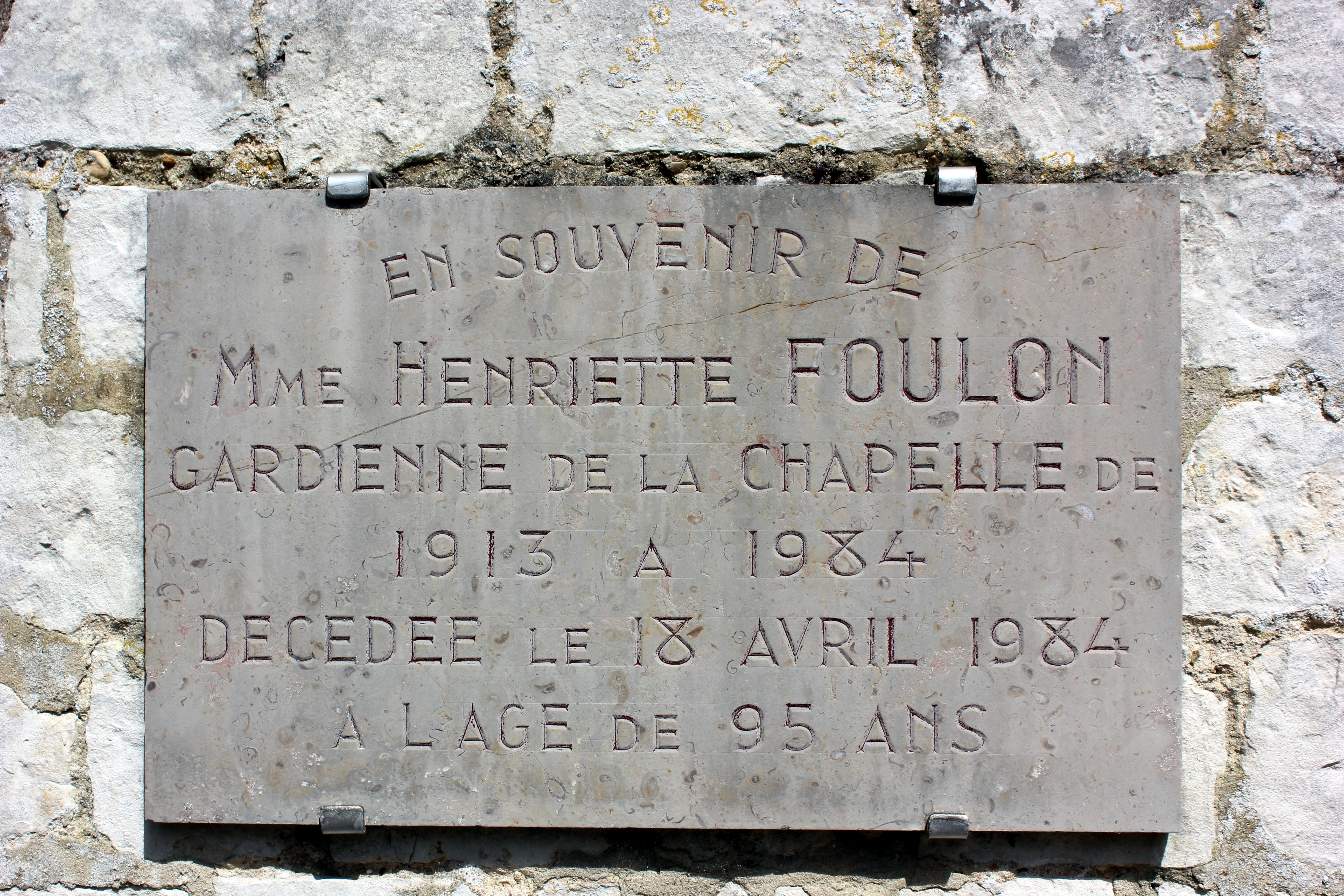 Plaque commémorative à la mémoire d'Henriette Foulon, gardienne de la chapelle.Immatriculation