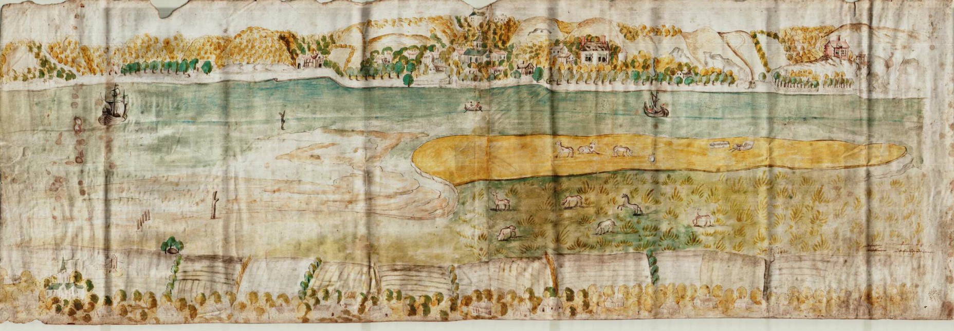 Vue de l’ile de Belcinac et de Villequier prise depuis la rive gauche de la Seine.- Dessin sur parchemin, 17e siècle (AD Seine-Maritime, 12 Fi 641/6).Immatriculation