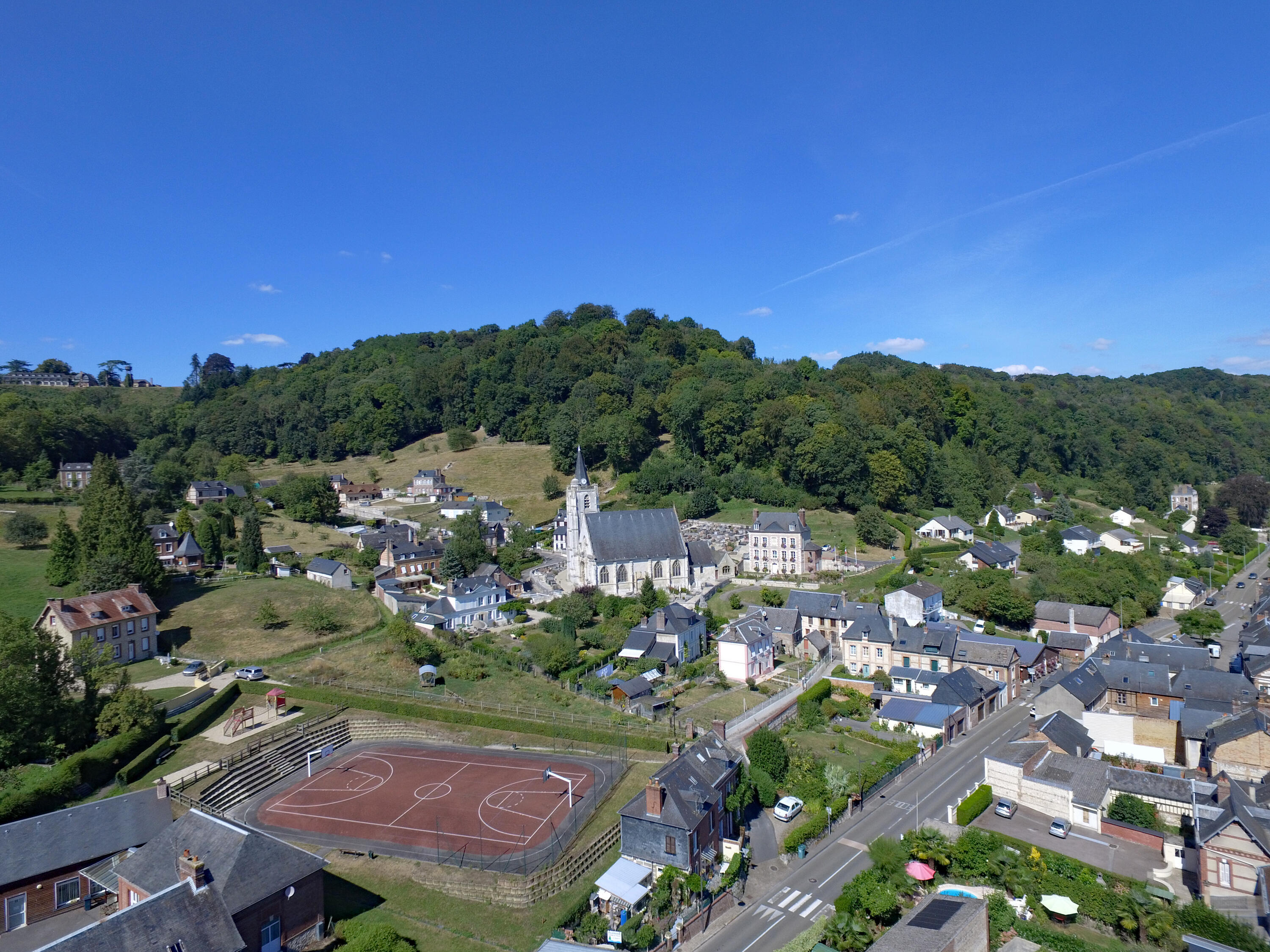 Quartier de l'église, angle sud-ouest.- Vue aérienne par drone, 2016 (JF Drone 'N Caux).Immatriculation