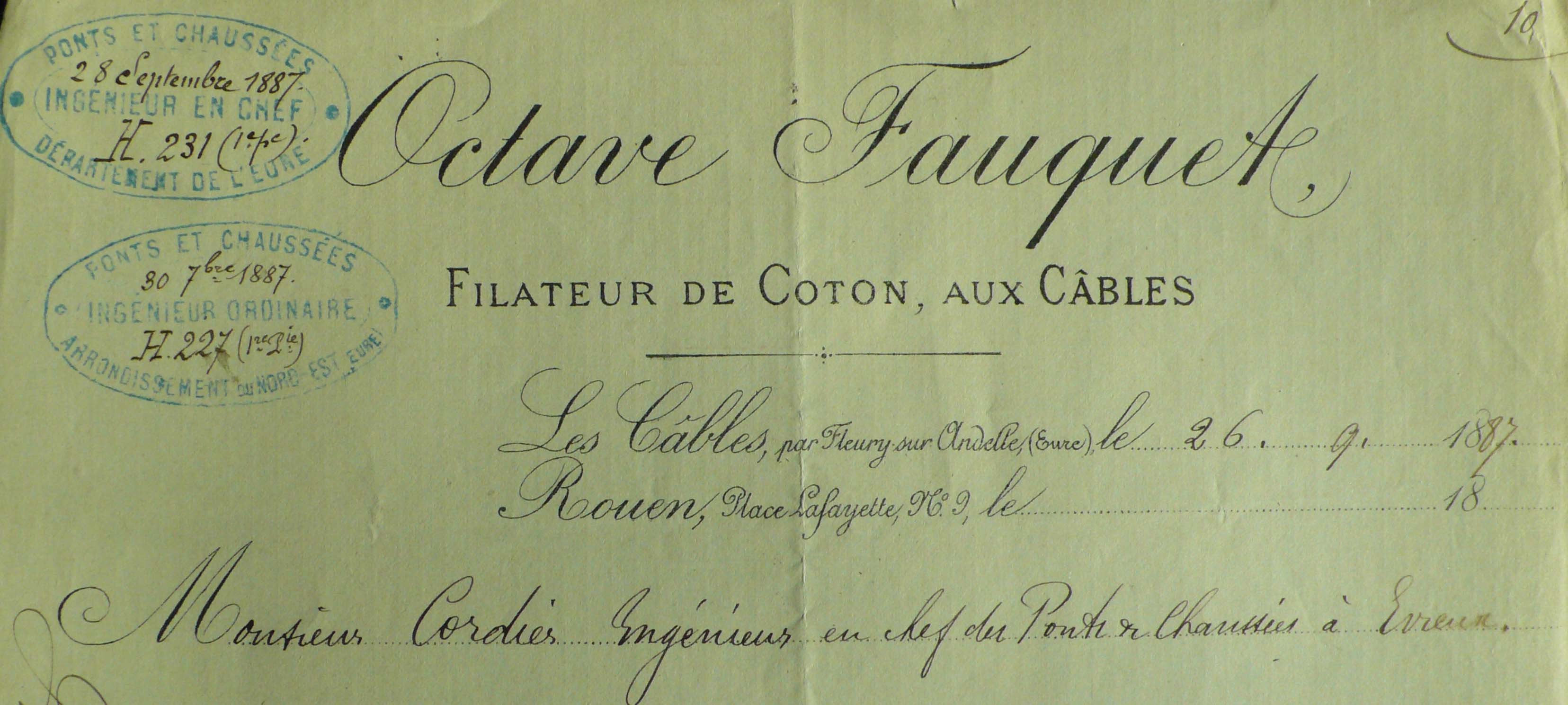 En-tête de lettre d'Octave Fauquet, 1887 (AD Eure. 18 S 88).Immatriculation