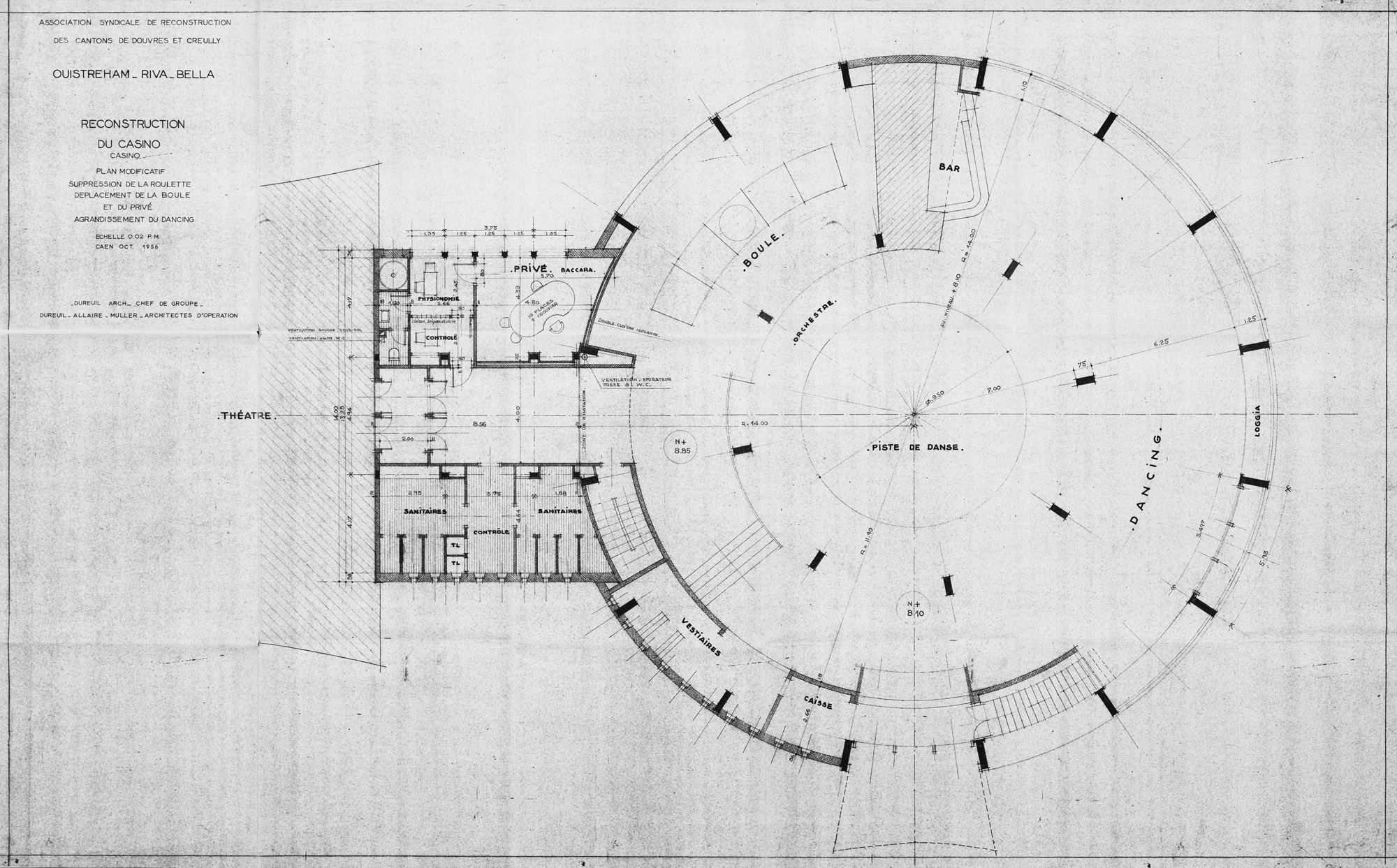 Association syndicale de reconstruction des cantons de Douvres et Creully. Ouistreham - Riva-Bella. Reconstruction du casino. Plan modificatif. Suppression de la roulette, déplacement de la boule et du privée, agrandissement du dancing.- Plan signé Dureuil, architecte, chef de groupe, Dureuil, Allaire et Muller, architectes d'opération, octobre 1956. Reprod. photoméca., échelle : 0,02m pour 1 mètre, 116,5 x 73 cm. (AC Ouistreham).Immatriculation