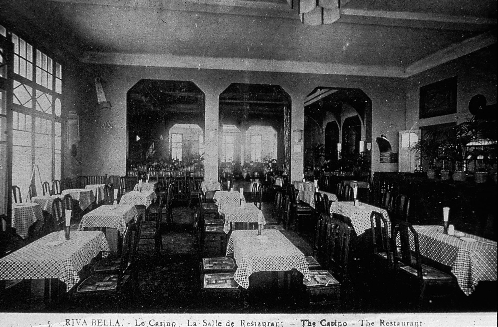 5. Riva-Bella. - Le Casino. La Salle de Restaurant, rez-de-chaussée [2ème casino dit le Casino Municipal].- Carte postale, n.s., n.d., entre 1931 et 1940, n. et b., 17,7 x 8,8 cm. (AC Ouistreham).Immatriculation