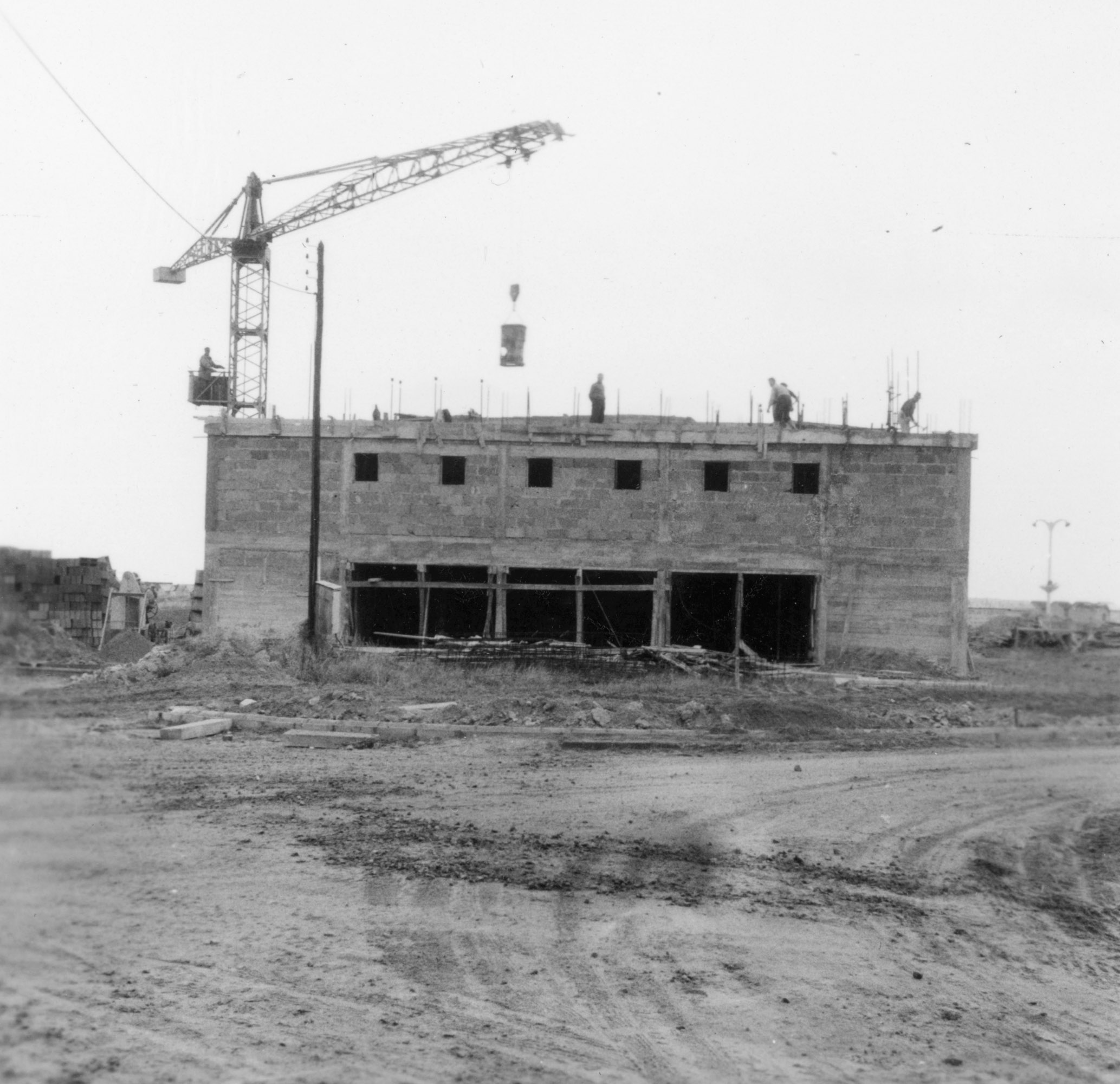 Reconstruction du casino. Théâtre, rez-de-chaussée et premier étage, vue prise du sud-ouest.- Photographie ancienne, n.s., 6 décembre 1956, [date manuscrite]. Tirage original sur papier brillant contrecollé sur carton, n. et b., 6,2 x 6,2 cm. (AC Ouistreham).Immatriculation