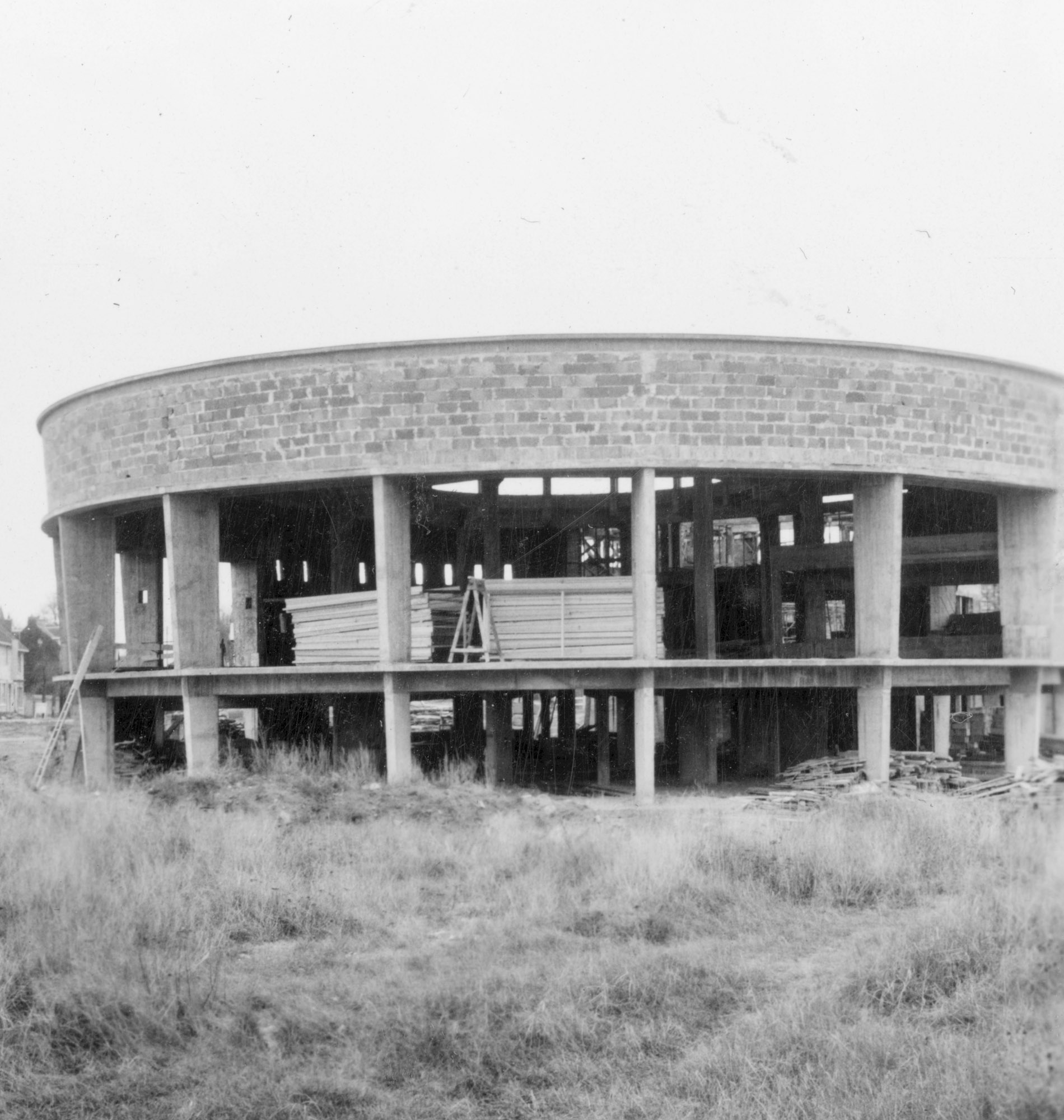 Reconstruction du casino. Rotonde, vue partielle prise du nord-est.- Photographie ancienne, n.s., 15 décembre 1956, [date manuscrite]. Tirage original sur papier brillant contrecollé sur carton, n. et b., 6,2 x 6,2 cm. (AC Ouistreham).Immatriculation
