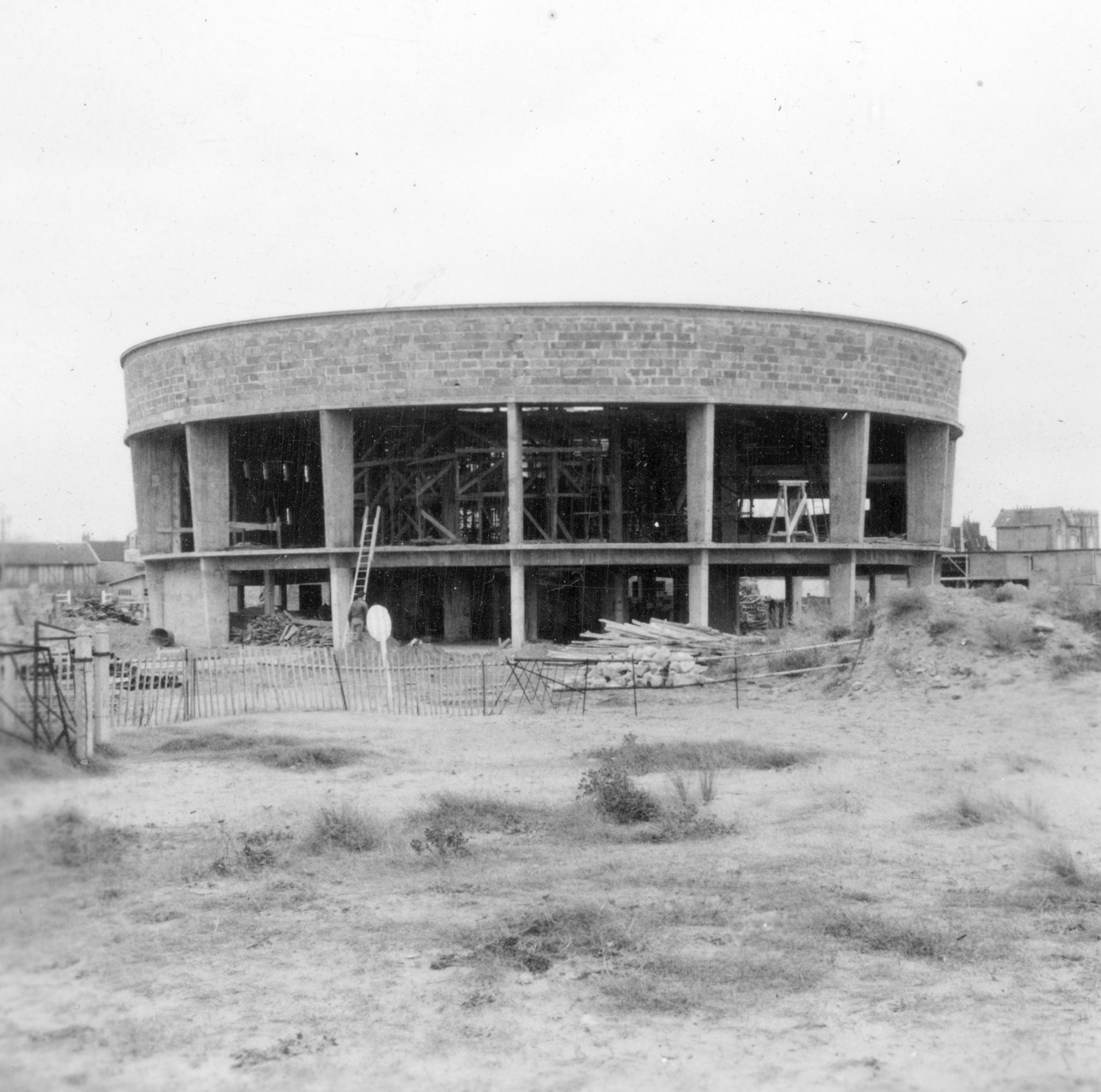 Reconstruction du casino. Rotonde, vue d'ensemble prise du nord-est.- Photographie ancienne, n.s., 6 décembre 1956, [date manuscrite]. Tirage original sur papier brillant contrecollé sur carton, n. et b., 6,2 x 6,2 cm. (AC Ouistreham).Immatriculation